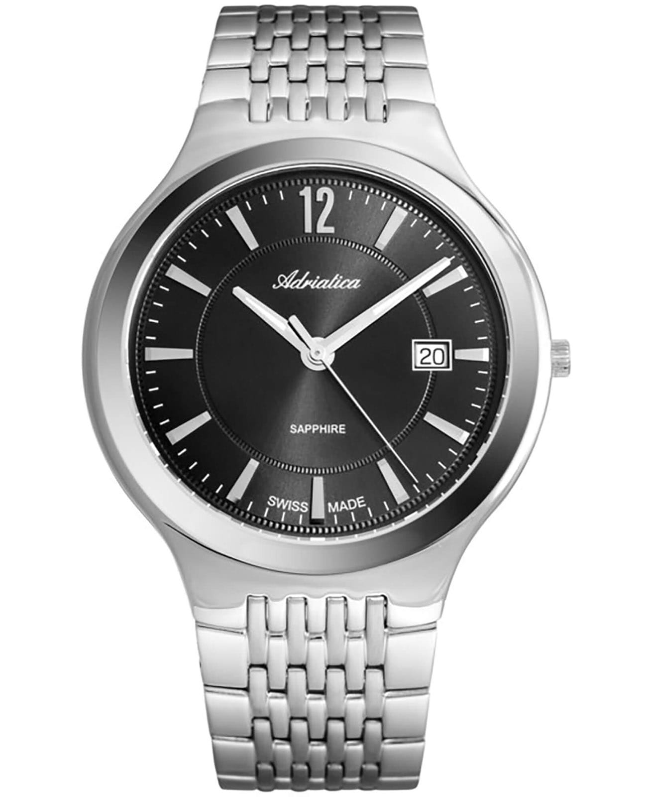 Мужские швейцарские наручные часы Adriatica Premiere A8296.5157Q, кварцевый механизм с высокой точностью. Сапфировое стеклоСапфировое стеклоПрочный и надёжный материал из кристалла сапфира синтетического происхождения, характеризующийся особой твёрдостью и устойчивостью к царапинам и повреждениям. устойчивое к появлению царапин, обладающее высокой прозрачностью. Класс водозащиты: 50 метров, позволит защитить корпус от случайных брызг или капель дождя. Корпус часов изготовлен из стали. Стальной браслет на раскладной застёжкеРаскладная застёжкаТакой тип застёжки используется только на браслетах из металла. Она никогда не раскрывается полностью, происходит разделение на 2 и более частей. Раскладывающая застёжка снизит вероятность потери часов к минимуму..