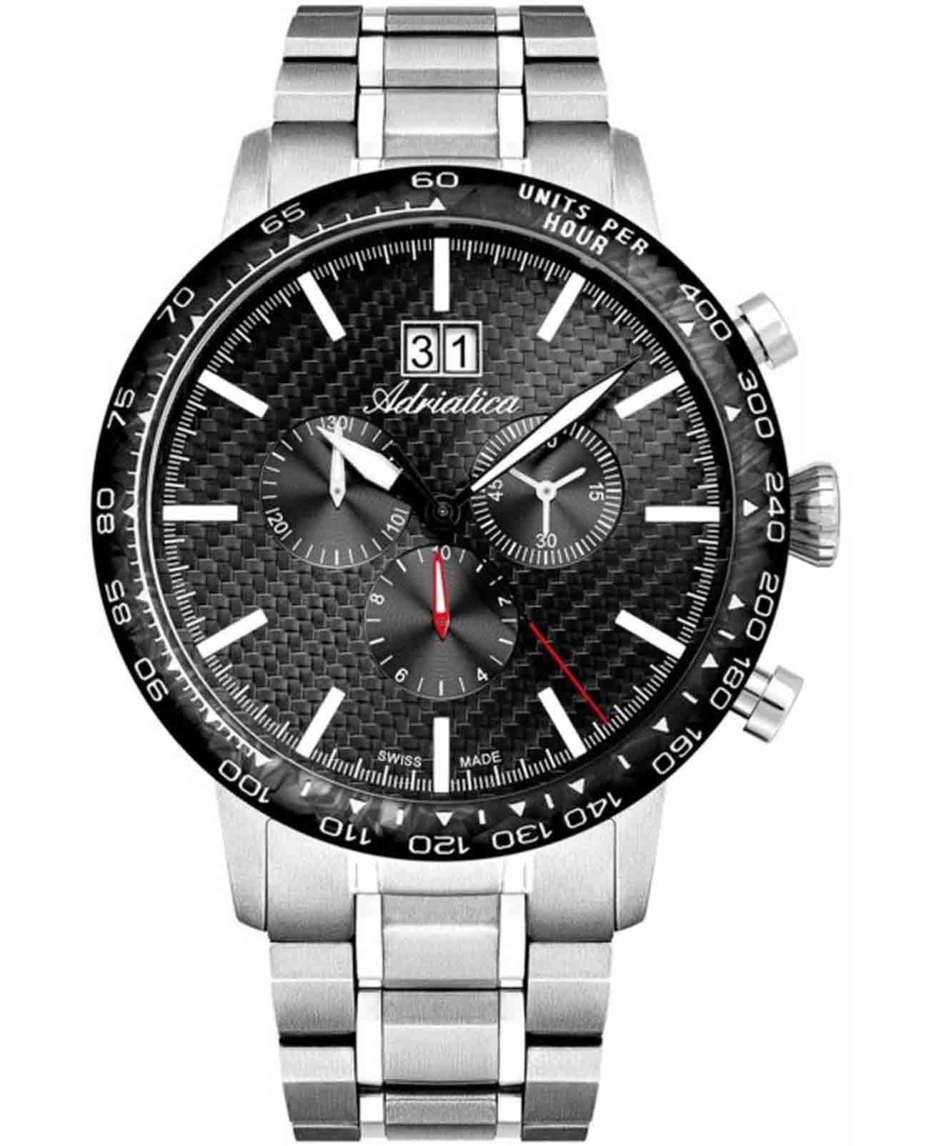 Мужские швейцарские часы-хронографХронографФункция позволяет измерять отрезки времени с особой точностью: часы, минуты, секунды. Верным признаком хронографа является наличие на циферблате 3 дополнительных окошек-счётчиков. с секундомеромСекундомерСекундоме́р — прибор, способный измерять интервалы времени с точностью до долей секунды. и тахиметромТахиметрРазмеченная шкала, располагается на ободке или безеле часов. Тахиметр позволяет рассчитать скорость на определённом участке пути, расстояние измеряется в километрах или милях. Adriatica Aviation A8383.4114CH воплощают в себе элегантность и функциональность, их выбирают целеустремленные мужчины, которые знают цену времени. Черный циферблат часов, защищенный сапфировым стекломСапфировое стеклоПрочный и надёжный материал из кристалла сапфира синтетического происхождения, характеризующийся особой твёрдостью и устойчивостью к царапинам и повреждениям., заключен в корпус из титана диаметром 46 мм и толщиной 12 мм. Надежный кварцевый механизм с калибром Ronda 5040.B обеспечивает высокую точность, а водозащита 5 ATM делает часы устойчивыми к воздействию воды. Стальной браслет с раскладной застёжкойРаскладная застёжкаТакой тип застёжки используется только на браслетах из металла. Она никогда не раскрывается полностью, происходит разделение на 2 и более частей. Раскладывающая застёжка снизит вероятность потери часов к минимуму. обеспечивает комфортное и надежное ношение. Циферблат с метками в виде штрихов имеет 3 дополнительных циферблата, а также окошко даты в положении «12» , что добавляет практичности в повседневной жизни. Люминесцентное покрытиеЛюминесцентное покрытиеПозволяет считывать показания времени в темноте. Производители наносят на стрелки, часовые индексы, безель или поверхность циферблата светонакопительный состав, дающий холодное свечение. на стрелках и метках обеспечивает отличную видимость в темноте.