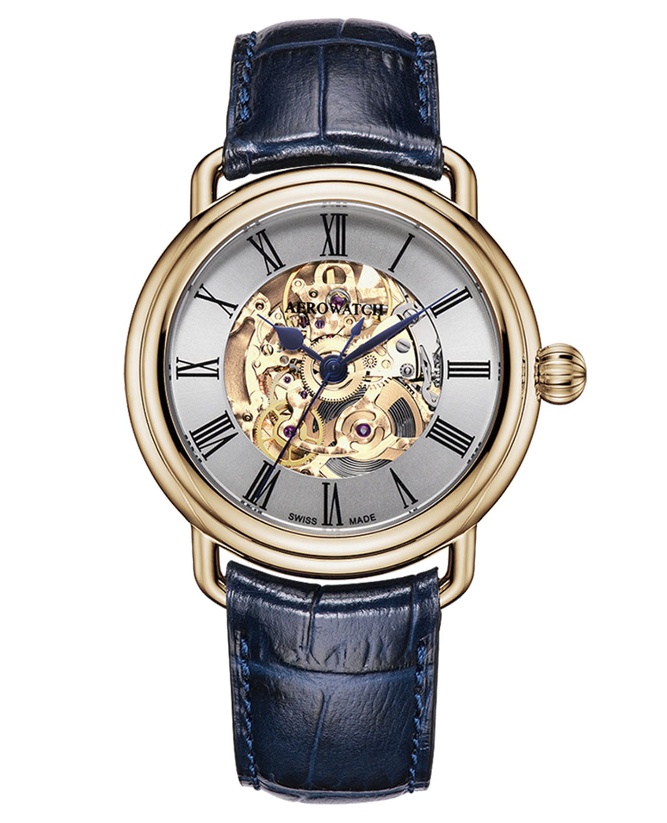 Мужские швейцарские механические часы с автоподзаводом Aerowatch 1942 60900 RO22. Сапфировое стеклоСапфировое стеклоПрочный и надёжный материал из кристалла сапфира синтетического происхождения, характеризующийся особой твёрдостью и устойчивостью к царапинам и повреждениям. устойчивое к появлению царапин, обладающее высокой прозрачностью. Корпус изготовлен из нержавеющей стали с PVDPVDУльтратонкое покрытие наносится в технике вакуумного напыления, сочетает в себе нитрид титана особой прочности со слоем золота или оксида хрома. Несёт в себе декоративную или защитную функцию. покрытием. В часах устаовлен автоматическийкалибр Sellita SW200-1 с 26 камнями. Механизм скелетонизирован и родирован, ручная обработка. Класс водозащиты: 50 метров, позволит защитить корпус от случайных брызг или капель дождя. Кожаный ремешок на стандартной застёжке.