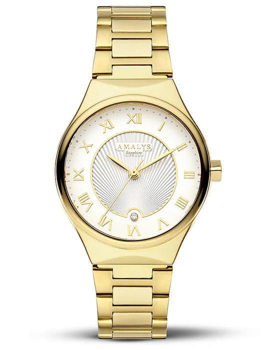 Amalys AMW-161 — женская модель с утончённым современным дизайном, в которой сочетаются минимализм и элегантность. Круглый корпус с PVD-покрытиемPVDУльтратонкое покрытие наносится в технике вакуумного напыления, сочетает в себе нитрид титана особой прочности со слоем золота или оксида хрома. Несёт в себе декоративную или защитную функцию. диаметром 31 мм гармонирует с браслетом с PVD-покрытиемPVDУльтратонкое покрытие наносится в технике вакуумного напыления, сочетает в себе нитрид титана особой прочности со слоем золота или оксида хрома. Несёт в себе декоративную или защитную функцию. шириной 16 мм, выполненным из нержавеющей стали и оснащённым раскладным замкомРаскладной замокДанный вариант застежки используется только на часах с металлическим браслетом. Отличительная особенность такого крепления в том, что длина браслета становится универсальной и вы можете самостоятельно отрегулировать нужный вам размер – застежка просто двигается по браслету часов., обеспечивающим удобство и надёжность при носке. Механизм — кварцевый, что гарантирует точный и стабильный ход. Защитную функцию выполняет сапфировое стеклоСапфировое стеклоПрочный и надёжный материал из кристалла сапфира синтетического происхождения, характеризующийся особой твёрдостью и устойчивостью к царапинам и повреждениям., стойкое к царапинам и сохраняющее прозрачность. Водозащита 5 ATM делает модель устойчивой к случайным брызгам и кратковременному контакту с водой. Лаконичный циферблат с декоративным узором и изящными стрелками подчёркивает изысканный характер часов, создавая универсальный образ, подходящий как для повседневных ситуаций, так и для особых случаев.