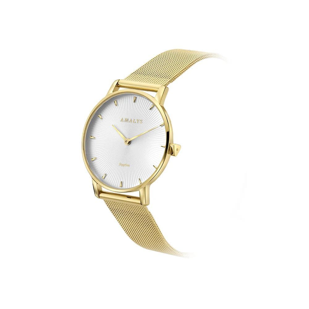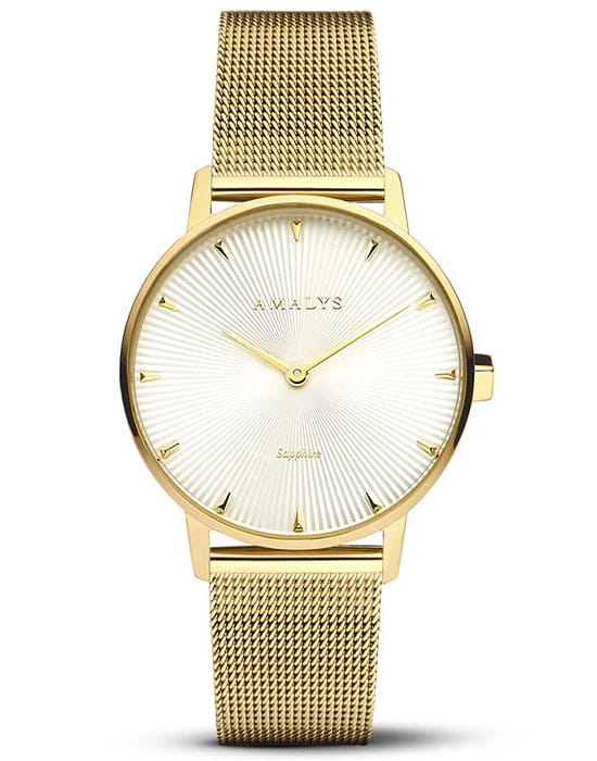 Amalys AMW-174 — женская модель с утончённым классическим дизайном, в которой сочетаются элегантность и практичность. Круглый корпус диаметром 33 мм выполнен из нержавеющей стали с PVD-покрытиемPVDУльтратонкое покрытие наносится в технике вакуумного напыления, сочетает в себе нитрид титана особой прочности со слоем золота или оксида хрома. Несёт в себе декоративную или защитную функцию., гармонирующим с браслетом шириной 16 мм в том же исполнении. Защитную функцию выполняет сапфировое стеклоСапфировое стеклоПрочный и надёжный материал из кристалла сапфира синтетического происхождения, характеризующийся особой твёрдостью и устойчивостью к царапинам и повреждениям., стойкое к царапинам и сохраняющее прозрачность. Механизм — кварцевый, обеспечивающий точность и стабильность хода. Браслет миланского плетения с PVD-покрытиемPVDУльтратонкое покрытие наносится в технике вакуумного напыления, сочетает в себе нитрид титана особой прочности со слоем золота или оксида хрома. Несёт в себе декоративную или защитную функцию. снабжён раскладным замкомРаскладной замокДанный вариант застежки используется только на часах с металлическим браслетом. Отличительная особенность такого крепления в том, что длина браслета становится универсальной и вы можете самостоятельно отрегулировать нужный вам размер – застежка просто двигается по браслету часов., который сочетает надёжность фиксации и удобство повседневного использования. Водозащита 3 ATM защищает часы от случайных брызг и дождя. Циферблат с римскими индексами и изящными стрелками подчёркивает классическую эстетику модели, делая её уместной как в повседневных образах, так и в торжественной обстановке.