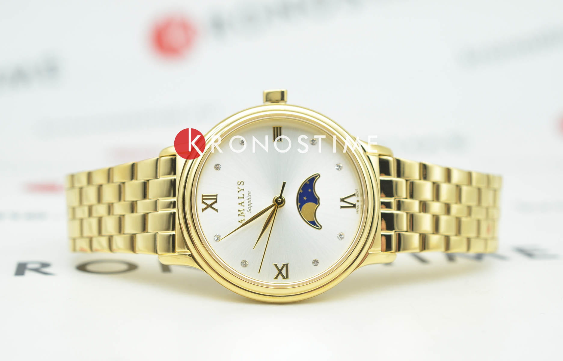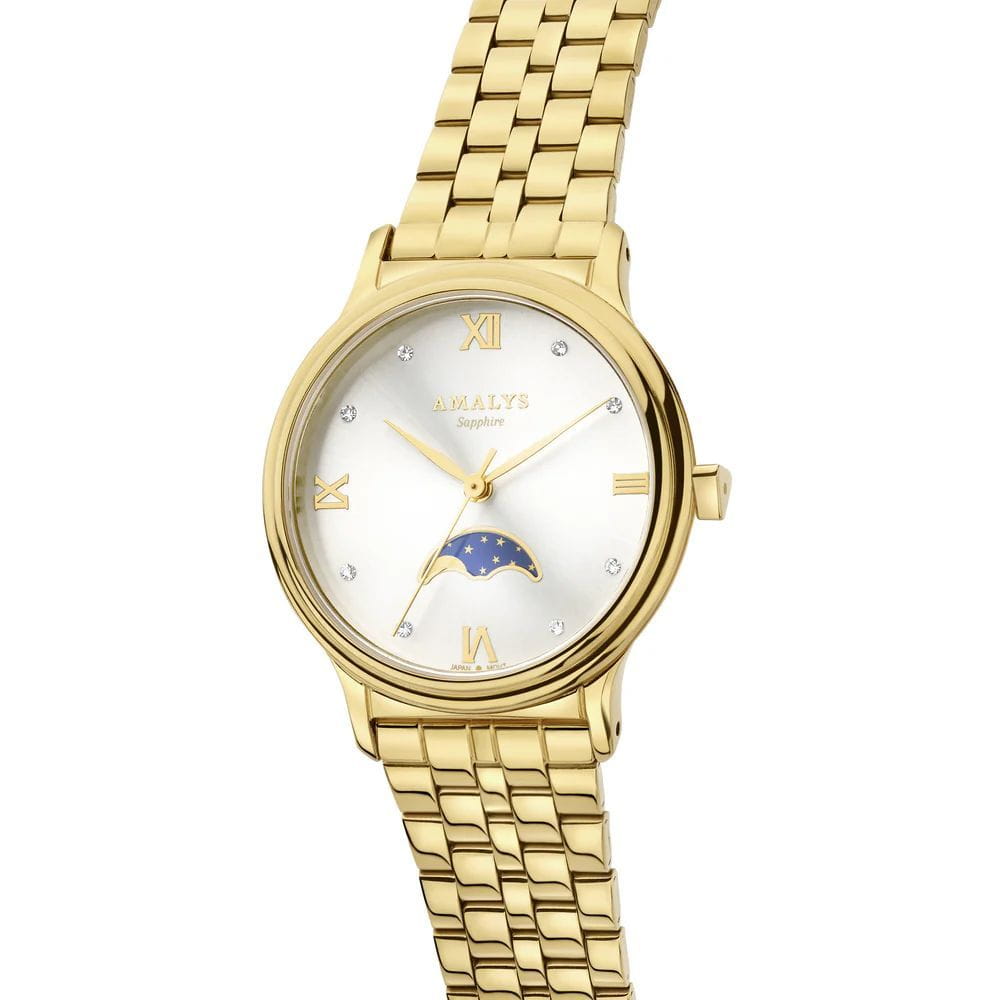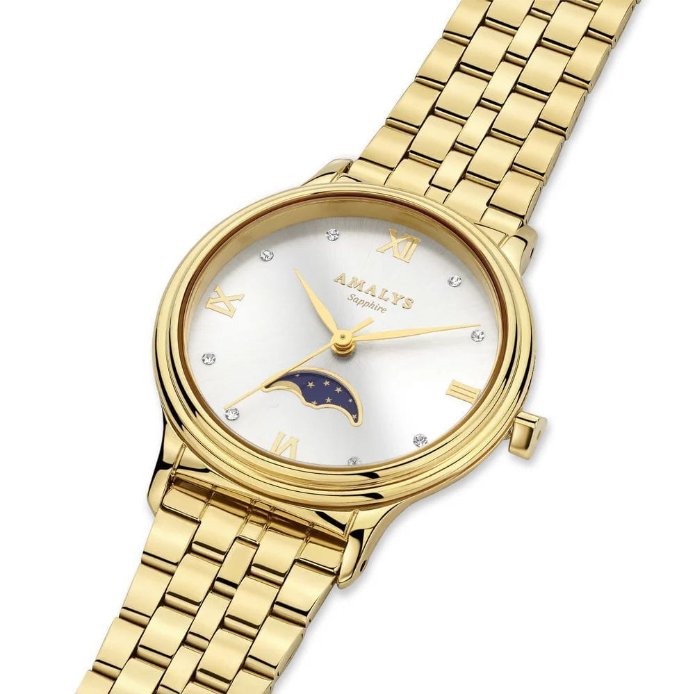 Amalys AMW-204 — женская модель с элегантным классическим стилем и утончёнными деталями. Круглый корпус изготовлен из нержавеющей стали с PVDPVDУльтратонкое покрытие наносится в технике вакуумного напыления, сочетает в себе нитрид титана особой прочности со слоем золота или оксида хрома. Несёт в себе декоративную или защитную функцию.-покрытием золотистого оттенка и гармонирует с браслетом в том же исполнении, состоящим из звеньев и обеспечивающим комфортное прилегание к запястью. Защитную функцию выполняет сапфировое стеклоСапфировое стеклоПрочный и надёжный материал из кристалла сапфира синтетического происхождения, характеризующийся особой твёрдостью и устойчивостью к царапинам и повреждениям., которое отличается стойкостью к царапинам и сохраняет высокую прозрачность. В основе лежит кварцевый механизм, гарантирующий точность хода и простоту эксплуатации. Циферблат украшен изящными римскими цифрами и метками, дополнен утончённым индикатором фаз Луны, который придаёт часам особый шарм и делает их акцентной деталью образа. Водозащита 3 ATM защищает от случайных брызг и дождя. Модель сочетает функциональность и изысканность, подойдёт как для повседневного стиля, так и для особых случаев.