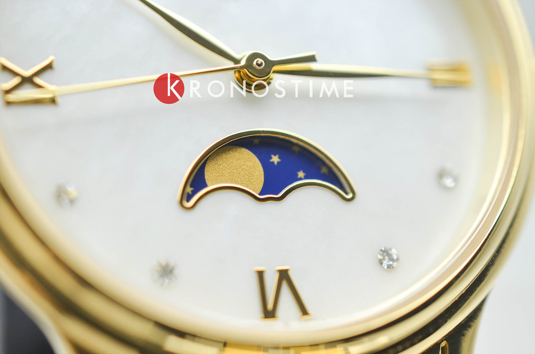 Amalys AMW-205 — женская модель с элегантным классическим стилем и утончёнными деталями. Круглый корпус изготовлен из нержавеющей стали с PVDPVDУльтратонкое покрытие наносится в технике вакуумного напыления, сочетает в себе нитрид титана особой прочности со слоем золота или оксида хрома. Несёт в себе декоративную или защитную функцию.-покрытием золотистого оттенка и гармонирует с браслетом в том же исполнении, состоящим из звеньев и обеспечивающим комфортное прилегание к запястью. Защитную функцию выполняет сапфировое стеклоСапфировое стеклоПрочный и надёжный материал из кристалла сапфира синтетического происхождения, характеризующийся особой твёрдостью и устойчивостью к царапинам и повреждениям., которое отличается стойкостью к царапинам и сохраняет высокую прозрачность. В основе лежит кварцевый механизм, гарантирующий точность хода и простоту эксплуатации. Циферблат украшен изящными римскими цифрами и метками, дополнен утончённым индикатором фаз Луны, который придаёт часам особый шарм и делает их акцентной деталью образа. Водозащита 3 ATM защищает от случайных брызг и дождя. Модель сочетает функциональность и изысканность, подойдёт как для повседневного стиля, так и для особых случаев.