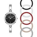 Корпус часов выполнен из стали, что продлевает срок службы и улучшает их стойкость. Стальной браслет с раскладной застёжкойРаскладная застёжкаТакой тип застёжки используется только на браслетах из металла. Она никогда не раскрывается полностью, происходит разделение на 2 и более частей. Раскладывающая застёжка снизит вероятность потери часов к минимуму. делает использование этих часов максимально удобным и надёжным. В комплекте с часами идут пять дополнительных безелейБезельВнешний ободок, закрепляющий стекло. В спортивных часах так называется поворотное кольцо с делениями на циферблате, выполняет роль таймера – замеряет отрезки времени на шкале. Неподвижный безель – элемент декора. Однонаправленно вращающийся безель на дайверских часах позволяет фиксировать моменты погружения и выныривания на поверхность., один из них с кристаллами, для возможности обновления вида часов.