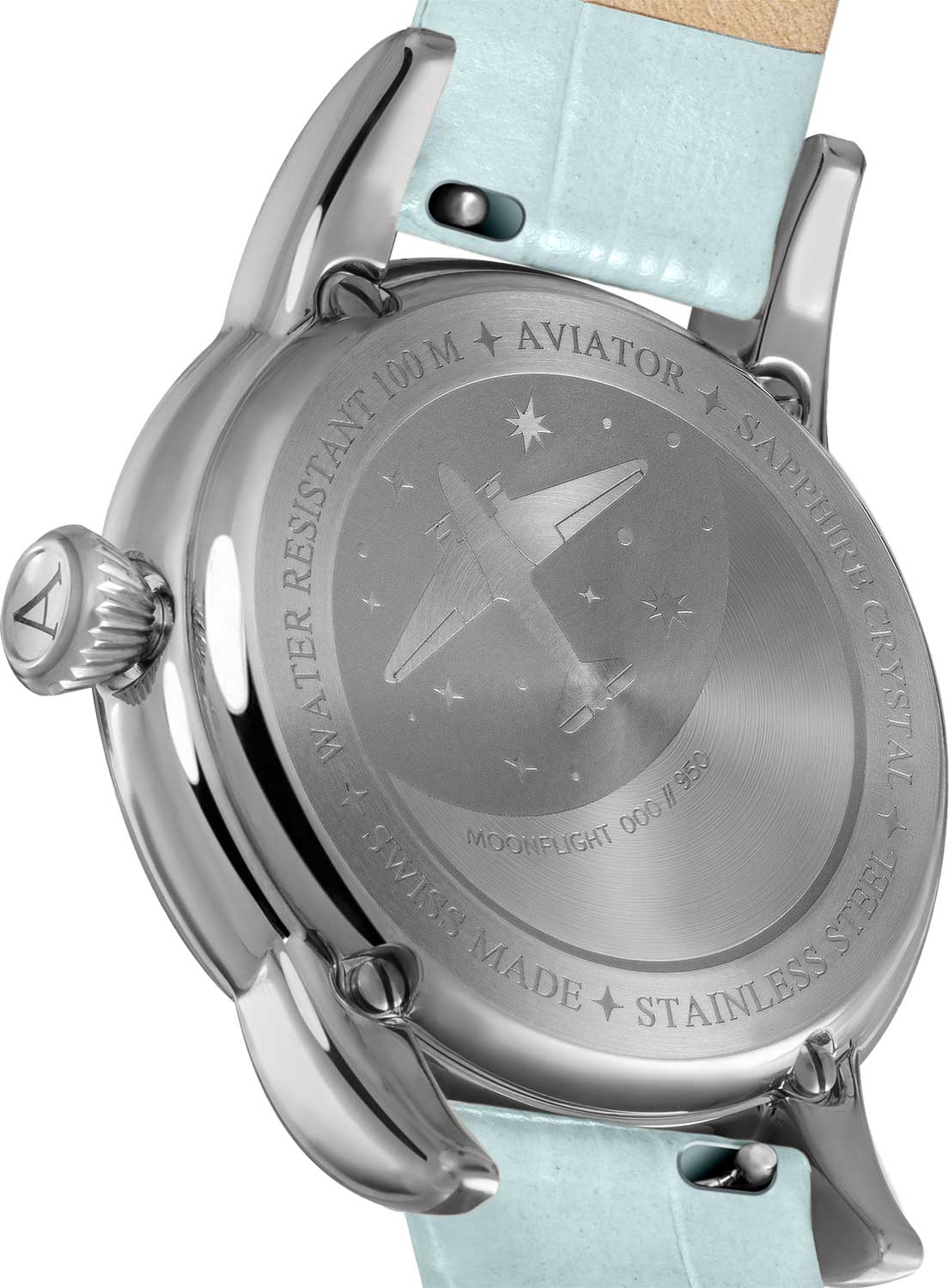 Aviator V.1.33.0.261.4 “Douglas Moonflight” — элегантный дамский швейцарский Moonphase с утончённой авиационной эстетикой. Корпус 36 мм из нержавеющей стали с полированной отделкой обладает компактными пропорциями и удобным литым профилем.