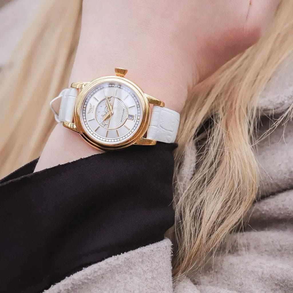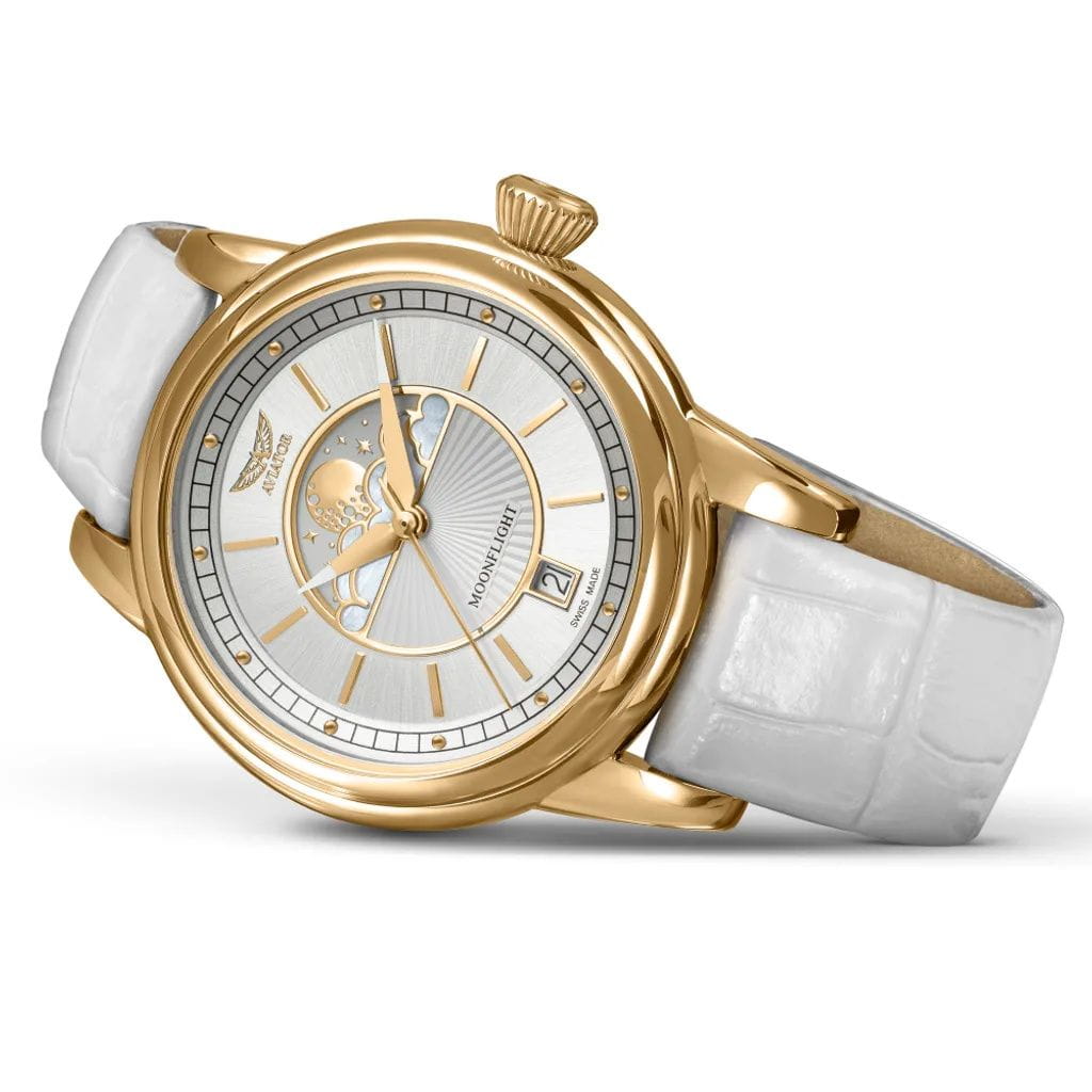 Aviator Douglas MoonFlight V.1.33.1.343.4 — элегантные дамские швейцарские часы с утончённой авиационной эстетикой. Корпус 36 мм из нержавеющей стали 316L с PVD-покрытиемPVDУльтратонкое покрытие наносится в технике вакуумного напыления, сочетает в себе нитрид титана особой прочности со слоем золота или оксида хрома. Несёт в себе декоративную или защитную функцию. обладает компактными пропорциями и удобным профилем. Циферблат в стиле Art Deco украшает усложнение фаз Луны в верхней половине, обрамлённой тонким кольцом облаков. Отмечено окно даты в положении «6 часов». Стрелки обработаны люминесцентным покрытиемЛюминесцентное покрытиеПозволяет считывать показания времени в темноте. Производители наносят на стрелки, часовые индексы, безель или поверхность циферблата светонакопительный состав, дающий холодное свечение. Superluminova — для уверенного считывания в темноте. Поверхность защищена сапфировым стекломСапфировое стеклоПрочный и надёжный материал из кристалла сапфира синтетического происхождения, характеризующийся особой твёрдостью и устойчивостью к царапинам и повреждениям. с антибликовым покрытиемАнтибликовое покрытиеСлой оксида металла в 0,13-0,3 микрон, благодаря которому стекло часов не бликует и не отражает свет. Антибликовое покрытие уменьшает отражение света в 10 раз, обеспечивая отличную читаемость показателей циферблата.. Сердце модели — швейцарский кварцевый механизм Ronda 708 с функцией отображения лунных фаз. Водозащита до 100 метров создают надёжную основу для эксплуатации. Кожаный ремень со стандартной застежкой сочетает в себе комфорт, элегантность и практичность. Aviator Douglas MoonFlight — это гармоничное сочетание авиационного наследия, женской элегантности и технической изысканности, воплощённое в элегантном и функциональном аксессуаре. Лимитированная серия.