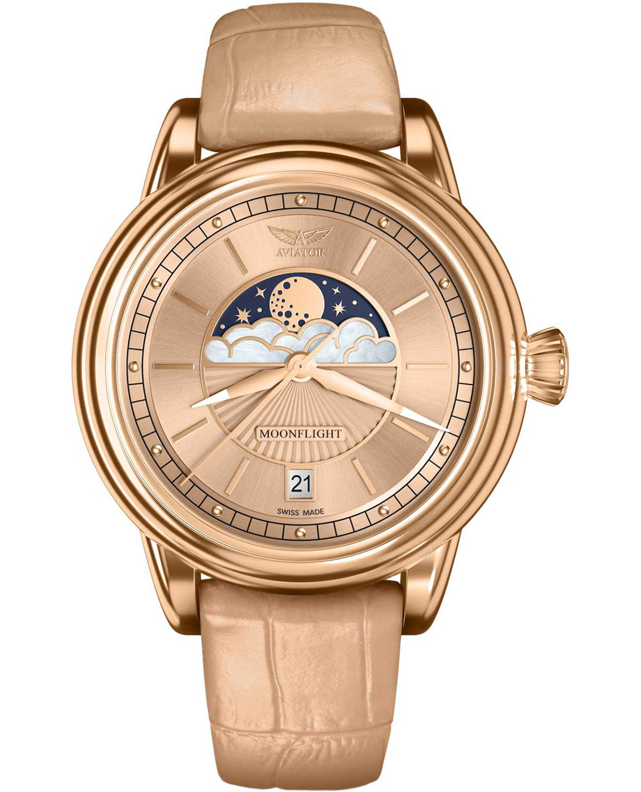 Aviator Douglas MoonFlight V.1.33.2.260.4 — элегантные дамские швейцарские часы с утончённой авиационной эстетикой. Корпус 36 мм из нержавеющей стали 316L с PVD-покрытиемPVDУльтратонкое покрытие наносится в технике вакуумного напыления, сочетает в себе нитрид титана особой прочности со слоем золота или оксида хрома. Несёт в себе декоративную или защитную функцию. обладает компактными пропорциями и удобным профилем. Циферблат в стиле Art Deco украшает усложнение фаз Луны в верхней половине, обрамлённой тонким кольцом облаков. Отмечено окно даты в положении «6 часов». Стрелки обработаны люминесцентным покрытиемЛюминесцентное покрытиеПозволяет считывать показания времени в темноте. Производители наносят на стрелки, часовые индексы, безель или поверхность циферблата светонакопительный состав, дающий холодное свечение. Superluminova — для уверенного считывания в темноте. Поверхность защищена сапфировым стекломСапфировое стеклоПрочный и надёжный материал из кристалла сапфира синтетического происхождения, характеризующийся особой твёрдостью и устойчивостью к царапинам и повреждениям. с антибликовым покрытиемАнтибликовое покрытиеСлой оксида металла в 0,13-0,3 микрон, благодаря которому стекло часов не бликует и не отражает свет. Антибликовое покрытие уменьшает отражение света в 10 раз, обеспечивая отличную читаемость показателей циферблата.. Сердце модели — швейцарский кварцевый механизм Ronda 708 с функцией отображения лунных фаз, 13 рубинами и возможностью работать до 54 месяцев без замены батареи. Завинчивающаяся задняя крышка с гравировкой Douglas DC-3 и водозащита до 100 метров создают надёжную основу для эксплуатации.Кожаный ремень со стандартной застежкой сочетает в себе комфорт, элегантность и практичность. Лимитированная серия - 950 экземпляров. Aviator Douglas MoonFlight — это гармоничное сочетание авиационного наследия, женской элегантности и технической изысканности, воплощённое в элегантном и функциональном аксессуаре.