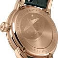Циферблат в стиле Art Deco украшает усложнение фаз Луны в верхней половине, обрамлённой тонким кольцом облаков. Отмечено окно даты в положении «6 часов». Стрелки и накладные метки обработаны люминесцентным покрытиемЛюминесцентное покрытиеПозволяет считывать показания времени в темноте. Производители наносят на стрелки, часовые индексы, безель или поверхность циферблата светонакопительный состав, дающий холодное свечение. Superluminova — для уверенного считывания в темноте. Поверхность защищена сапфировым стекломСапфировое стеклоПрочный и надёжный материал из кристалла сапфира синтетического происхождения, характеризующийся особой твёрдостью и устойчивостью к царапинам и повреждениям. с антибликовым покрытием.