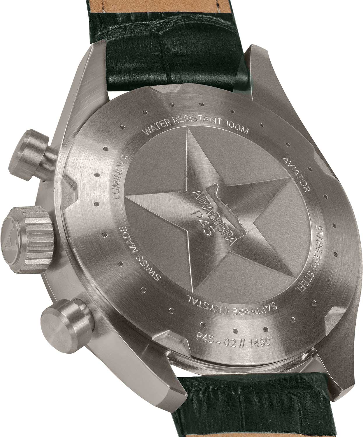 Aviator Airacobra V.2.25.7.171.4 — швейцарский GMT-хронограф в духе пилотских инструментов, объединяющий точность, удобство и лаконичный дизайн. Диаметр корпуса — 45 мм, выполнен из нержавеющей стали, что подчёркивает техническую надёжность в образе часов.