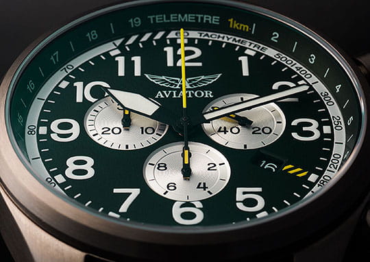 Циферблат оформлен в классическом aviator-стиле: крупные арабские цифры, широкие стрелки и чёткое деление минут позволяют считывать время мгновенно. Стрелки и метки покрыты люминесцентным покрытиемЛюминесцентное покрытиеПозволяет считывать показания времени в темноте. Производители наносят на стрелки, часовые индексы, безель или поверхность циферблата светонакопительный состав, дающий холодное свечение. для отличной читаемости при слабом освещении.