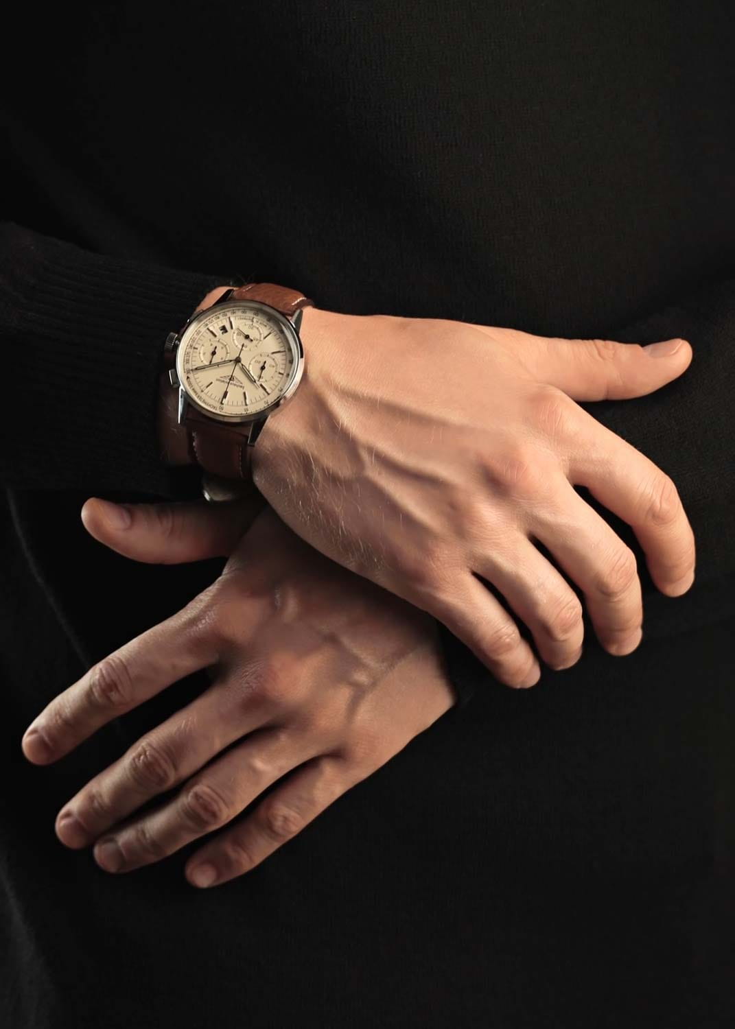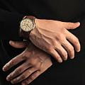 Мужские кварцевые часы-хронограф Bauhaus — это стильный аксессуар с авиационным вдохновением. Корпус диаметром 42 мм и толщиной 10 мм выполнен из стали с комбинированной матовой и полированной отделкой. Циферблат бежевого цвета выполнен по технологии Sunray («солнечные лучи») и оформлен штрихами и стрелками. Присутствуют три субциферблата хронографа. Окошко даты расположено между 4 и 5 часами. Метки и стрелки с люминесцентным покрытиемЛюминесцентное покрытиеПозволяет считывать показания времени в темноте. Производители наносят на стрелки, часовые индексы, безель или поверхность циферблата светонакопительный состав, дающий холодное свечение., обеспечивающим хорошую читаемость в темноте. Циферблат защищён прочным минеральным стекломМинеральное стеклоМинеральное стекло представляет собой искусственно выращенный минерал кварца. Такое стекло отличается особой устойчивостью к повреждениям и царапинам. Уступает по некоторым качествам сапфировому стеклу. K1. Механизм — кварцевый с функциями хронографаХронографФункция позволяет измерять отрезки времени с особой точностью: часы, минуты, секунды. Верным признаком хронографа является наличие на циферблате 3 дополнительных окошек-счётчиков. и секундомераСекундомерСекундоме́р — прибор, способный измерять интервалы времени с точностью до долей секунды.. Рифлёная заводная головка украшена фирменным логотипом. Часы оснащены кожаным ремешком с декоративной белой строчкой и классической пряжкой. Водонепроницаемость 100 м позволяет использовать часы для плавания и повседневного ношения. Идеальный выбор для тех, кто ценит немецкое качество и функциональный дизайн.