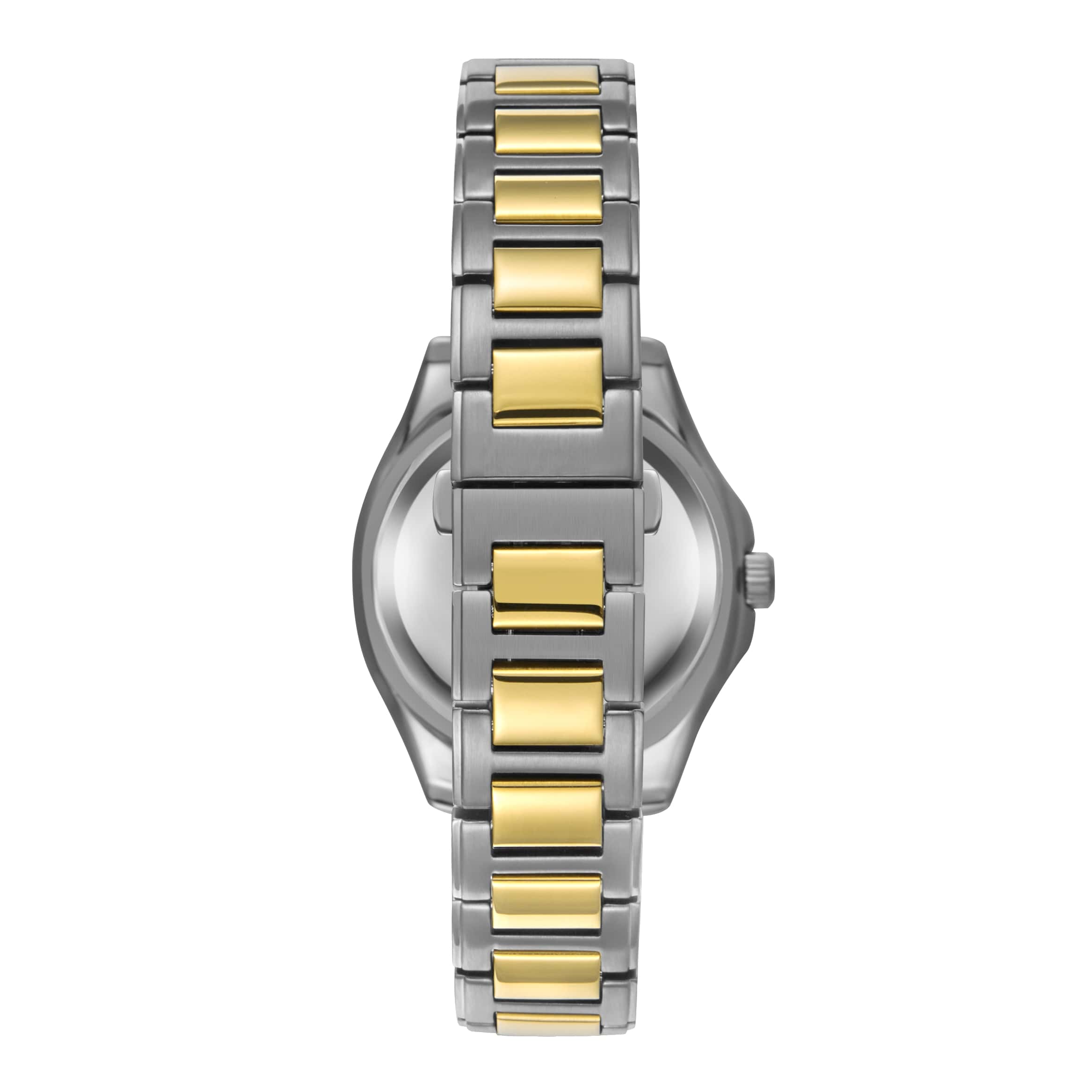Beverly Hills Polo Club BP3700C.270 – элегантные женские часы, сочетающие стильный дизайн и высокую функциональность. Корпус диаметром 34 мм выполнен из суперметалла, обеспечивающего прочность и долговечность. Циферблат украшен, и защищён минеральным стекломМинеральное стеклоМинеральное стекло представляет собой искусственно выращенный минерал кварца. Такое стекло отличается особой устойчивостью к повреждениям и царапинам. Уступает по некоторым качествам сапфировому стеклу., устойчивым к царапинам. БезельБезельВнешний ободок, закрепляющий стекло. В спортивных часах так называется поворотное кольцо с делениями на циферблате, выполняет роль таймера – замеряет отрезки времени на шкале. Неподвижный безель – элемент декора. Однонаправленно вращающийся безель на дайверских часах позволяет фиксировать моменты погружения и выныривания на поверхность. с PVD-покрытиемPVDУльтратонкое покрытие наносится в технике вакуумного напыления, сочетает в себе нитрид титана особой прочности со слоем золота или оксида хрома. Несёт в себе декоративную или защитную функцию.. Часы оснащены точным кварцевым механизмом, гарантирующим надёжное отображение времени. Браслет из нержавеющей стали с PVD-покрытиемPVDУльтратонкое покрытие наносится в технике вакуумного напыления, сочетает в себе нитрид титана особой прочности со слоем золота или оксида хрома. Несёт в себе декоративную или защитную функцию. на застёжке-бабочке с кнопкамиЗастёжка "бабочка"Такой вид застёжки дополняется предохранителями, помогающими избежать случайного раскрытия браслета. Обладают изящным исполнением. , обеспечивающей комфортное ношение и надёжную фиксацию на запястье. Водозащита до 50 метров (5 ATM) позволяет использовать часы в повседневной жизни, включая кратковременное погружение в воду.