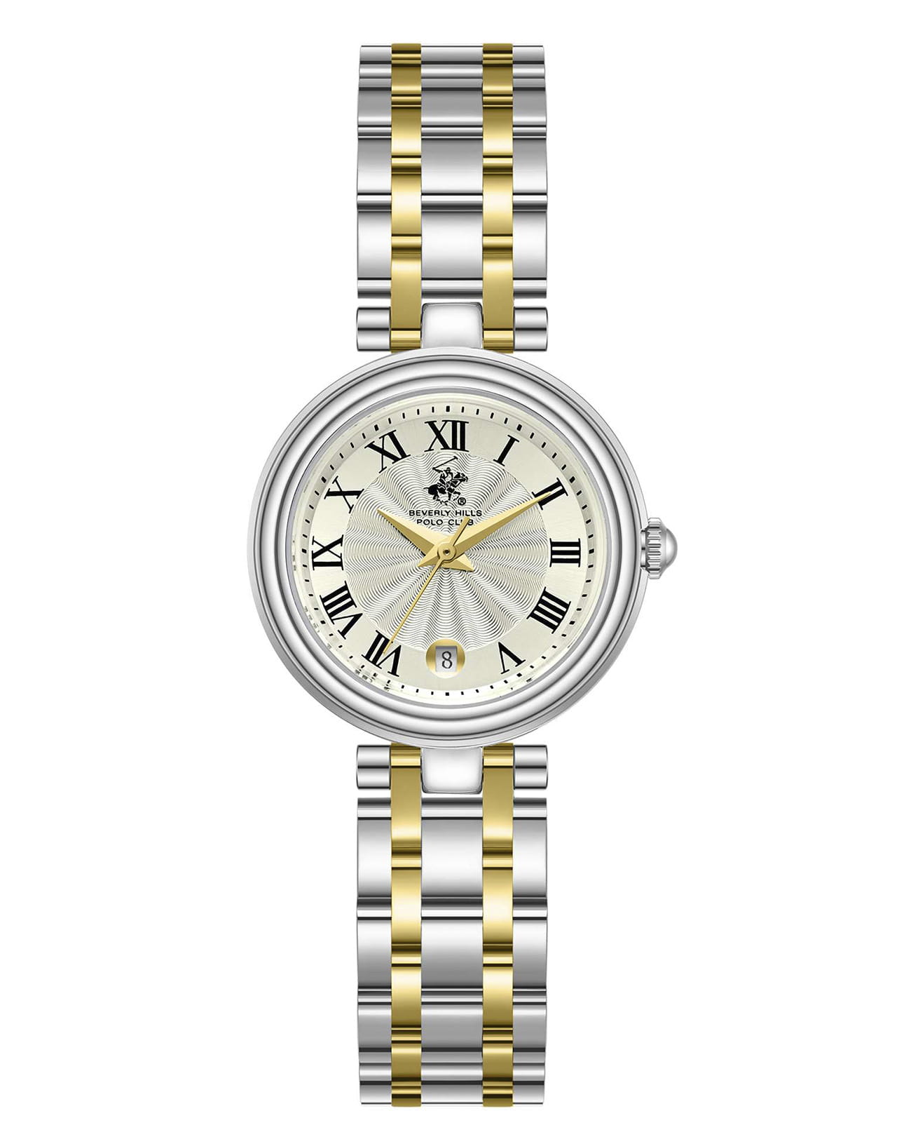 Женские кварцевые часы Beverly Hills Polo Club — это элегантный аксессуар. Корпус диаметром 26 мм выполнен из нержавеющей стали. Циферблат оформлен индексами и стрелками. Окошко даты расположено в положении 6 часов. Циферблат защищён минеральным стекломМинеральное стеклоМинеральное стекло представляет собой искусственно выращенный минерал кварца. Такое стекло отличается особой устойчивостью к повреждениям и царапинам. Уступает по некоторым качествам сапфировому стеклу.. Часы оснащены стальным браслетом с частичным IP-покрытиемIP-покрытиеМетод ионного напыления. Демонстрирует повышенную устойчивость к истиранию, окислению и химическим веществам. Под воздействием высокого давления и температуры около 1500°C молекулы металла надёжно соединяются с частицами корпуса часов. на застёжке «бабочка» с кнопкамиЗастёжка "бабочка"Такой вид застёжки дополняется предохранителями, помогающими избежать случайного раскрытия браслета. Обладают изящным исполнением. . Водонепроницаемость 30 м позволяет использовать часы в повседневных условиях. Идеальный выбор для тех, кто ценит стиль и качество.