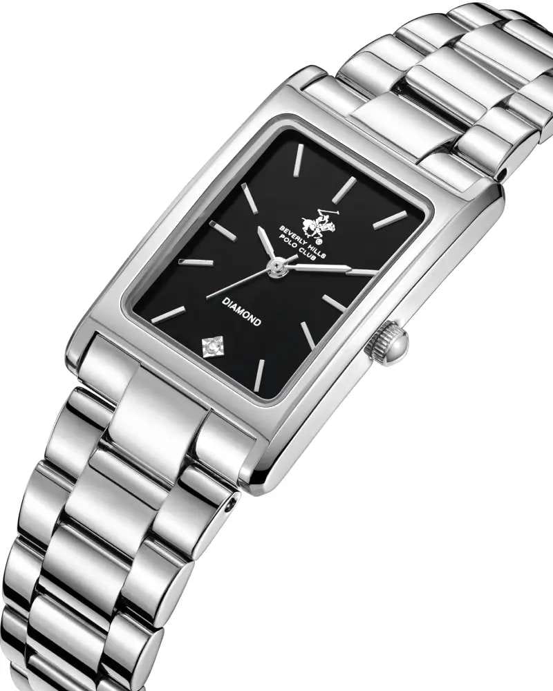 Женские кварцевые часы Beverly Hills Polo Club — это изысканный аксессуар, подчеркивающий индивидуальность и элегантность. Корпус размером 22,5×34,5 мм выполнен из стали 316L. Циферблат чёрного цвета оформлен штрихами, стрелками и инкрустирован одним синтетическим бриллиантом. Циферблат защищён минеральным стекломМинеральное стеклоМинеральное стекло представляет собой искусственно выращенный минерал кварца. Такое стекло отличается особой устойчивостью к повреждениям и царапинам. Уступает по некоторым качествам сапфировому стеклу. с сапфировым покрытием. Часы оснащены стальным браслетом из стали 316L на застёжке «бабочка» с кнопкамиЗастёжка "бабочка"Такой вид застёжки дополняется предохранителями, помогающими избежать случайного раскрытия браслета. Обладают изящным исполнением. . Водонепроницаемость 30 м позволяет использовать часы в повседневных условиях. Идеальный выбор для тех, кто ценит американское качество и универсальный дизайн.