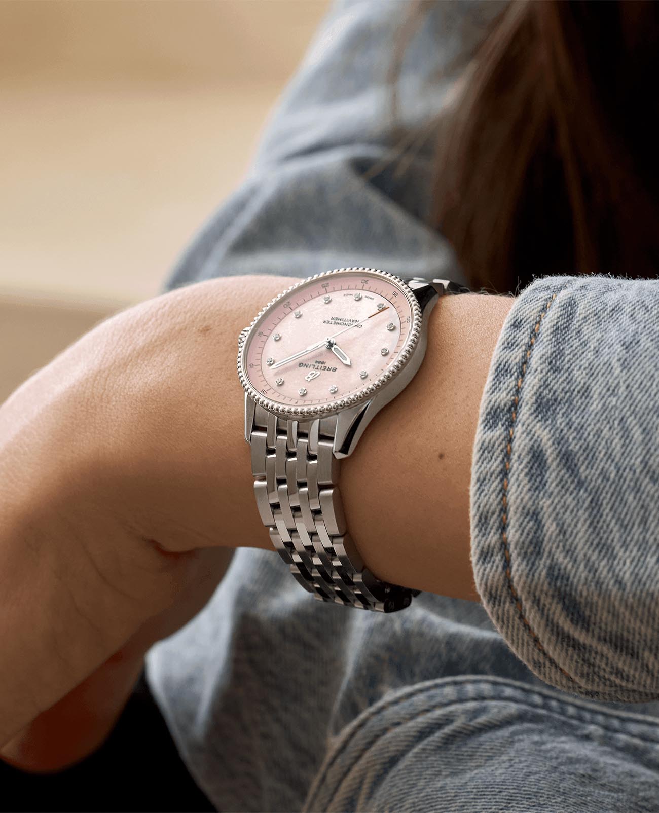 Швейцарские унисекс часы-хронометр Breitling Navitimer Automatic 32 A77320D91K1A1, механический механизм (автоматический калибр) с высокой точностью. Сапфировое стеклоСапфировое стеклоПрочный и надёжный материал из кристалла сапфира синтетического происхождения, характеризующийся особой твёрдостью и устойчивостью к царапинам и повреждениям. устойчивое к появлению царапин, обладающее высокой прозрачностью. Класс водозащиты: 50 метров, позволит защитить корпус от случайных брызг или капель дождя. Корпус и браслет часов изготовлены из нержавеющей стали. Стальной браслет на застёжке-бабочке с кнопкамиЗастёжка "бабочка"Такой вид застёжки дополняется предохранителями, помогающими избежать случайного раскрытия браслета. Обладают изящным исполнением. . Стрелки с люминесцентным покрытиемЛюминесцентное покрытиеПозволяет считывать показания времени в темноте. Производители наносят на стрелки, часовые индексы, безель или поверхность циферблата светонакопительный состав, дающий холодное свечение.. Циферблат инкрустирован бриллантами.
