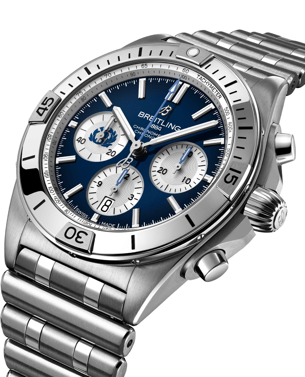 Лимитированные мужские швейцарские часы-хронографХронографФункция позволяет измерять отрезки времени с особой точностью: часы, минуты, секунды. Верным признаком хронографа является наличие на циферблате 3 дополнительных окошек-счётчиков. с секундомеромСекундомерСекундоме́р — прибор, способный измерять интервалы времени с точностью до долей секунды. Breitling Chronomat B01 42 AB0134A51C1A1, механический механизм (автоматический калибр) с высокой точностью. Основанный на хронографе Frecce Tricolori, который был разработан и выпущен в 1983 году в сотрудничестве со знаменитой итальянской авиационной эскадрильей, Chronomat стильно отпраздновал столетие Breitling и ознаменовал возвращение механическому хронографу его законного места в бренде, который построил свою мировую репутацию на этих невероятных часах. Сапфировое стеклоСапфировое стеклоПрочный и надёжный материал из кристалла сапфира синтетического происхождения, характеризующийся особой твёрдостью и устойчивостью к царапинам и повреждениям. устойчивое к появлению царапин, обладающее высокой прозрачностью. Класс водозащиты: 200 метров, позволит плавать, нырять и заниматься другими водными видами спорта. Корпус и браслет часов изготовлены из нержавеющей стали. Часы имеют сертификат COSCСертификат COSCОфициальный сертификат, подтверждающий то, что часы ходят с особо высокой точностью. Для получения документа часы подвергаются тестовым испытаниям, разработанным швейцарским институтом тестирования хронометров COSC. Допустимая норма для механических часов -4/+6 секунд в день, для кварцевых моделей +/- 0,07 секунд в день.. Стрелки и метки с люминесцентным покрытиемЛюминесцентное покрытиеПозволяет считывать показания времени в темноте. Производители наносят на стрелки, часовые индексы, безель или поверхность циферблата светонакопительный состав, дающий холодное свечение.. Шкала тахиметраТахиметрРазмеченная шкала, располагается на ободке или безеле часов. Тахиметр позволяет рассчитать скорость на определённом участке пути, расстояние измеряется в километрах или милях. на циферблате. Окошко даты находится в положении 6 часов. Браслет с застёжкой-бабочкой с кнопкамиЗастёжка "бабочка"Такой вид застёжки дополняется предохранителями, помогающими избежать случайного раскрытия браслета. Обладают изящным исполнением. .