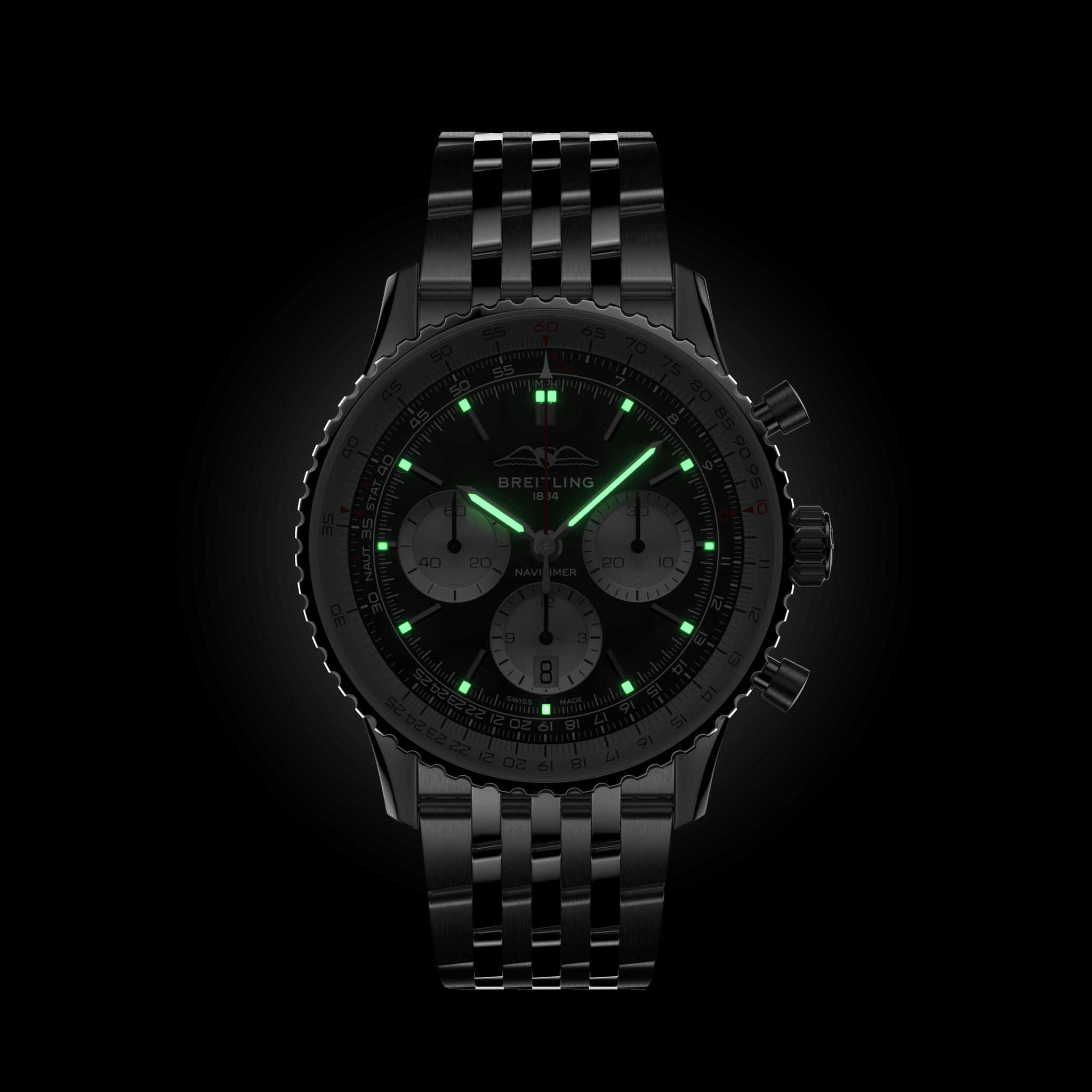 Мужские швейцарские часы-хронографХронографФункция позволяет измерять отрезки времени с особой точностью: часы, минуты, секунды. Верным признаком хронографа является наличие на циферблате 3 дополнительных окошек-счётчиков. с секундомеромСекундомерСекундоме́р — прибор, способный измерять интервалы времени с точностью до долей секунды. Breitling Navitimer B01 Chronograph 43 AB0138211B1A1, механический механизм (автоматический калибр) с высокой точностью. Сапфировое стеклоСапфировое стеклоПрочный и надёжный материал из кристалла сапфира синтетического происхождения, характеризующийся особой твёрдостью и устойчивостью к царапинам и повреждениям. с антибликовым покрытием устойчивое к появлению царапин, обладающее высокой прозрачностью. Класс водозащиты: 30 метров, позволит защитить корпус от случайных брызг или капель дождя. Корпус часов изготовлен из стали. Стальной браслет с застёжкой-бабочкой с кнопкамиЗастёжка "бабочка"Такой вид застёжки дополняется предохранителями, помогающими избежать случайного раскрытия браслета. Обладают изящным исполнением. . Шкала тахиметраТахиметрРазмеченная шкала, располагается на ободке или безеле часов. Тахиметр позволяет рассчитать скорость на определённом участке пути, расстояние измеряется в километрах или милях. на циферблате. Часы имеют сертификат COSCСертификат COSCОфициальный сертификат, подтверждающий то, что часы ходят с особо высокой точностью. Для получения документа часы подвергаются тестовым испытаниям, разработанным швейцарским институтом тестирования хронометров COSC. Допустимая норма для механических часов -4/+6 секунд в день, для кварцевых моделей +/- 0,07 секунд в день.. Окошко даты находится в положении 6 часов. Стрелки и метки с люминесцентным покрытиемЛюминесцентное покрытиеПозволяет считывать показания времени в темноте. Производители наносят на стрелки, часовые индексы, безель или поверхность циферблата светонакопительный состав, дающий холодное свечение..