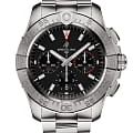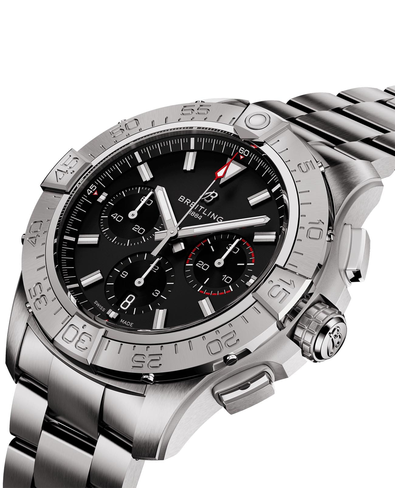 Мужские наручные часы c хронографомХронографФункция позволяет измерять отрезки времени с особой точностью: часы, минуты, секунды. Верным признаком хронографа является наличие на циферблате 3 дополнительных окошек-счётчиков. Breitling Avenger B01 Chronograph 44 AB0147101B1A1 с надёжным автоматическим механизмом. Корпус часов изготовлен из нержавеющей стали. Сапфировое стеклоСапфировое стеклоПрочный и надёжный материал из кристалла сапфира синтетического происхождения, характеризующийся особой твёрдостью и устойчивостью к царапинам и повреждениям. с антибликовым покрытием, устойчивое к мелким механическим повреждениям. Стальной браслет с раскладной застёжкойРаскладная застёжкаТакой тип застёжки используется только на браслетах из металла. Она никогда не раскрывается полностью, происходит разделение на 2 и более частей. Раскладывающая застёжка снизит вероятность потери часов к минимуму.. Стрелки и метки с люминесцентным покрытиемЛюминесцентное покрытиеПозволяет считывать показания времени в темноте. Производители наносят на стрелки, часовые индексы, безель или поверхность циферблата светонакопительный состав, дающий холодное свечение.. Однонаправленный безельБезельВнешний ободок, закрепляющий стекло. В спортивных часах так называется поворотное кольцо с делениями на циферблате, выполняет роль таймера – замеряет отрезки времени на шкале. Неподвижный безель – элемент декора. Однонаправленно вращающийся безель на дайверских часах позволяет фиксировать моменты погружения и выныривания на поверхность.. Класс водозащиты: 300 метров, позволит плавать, нырять и заниматься другими водными видами спорта.