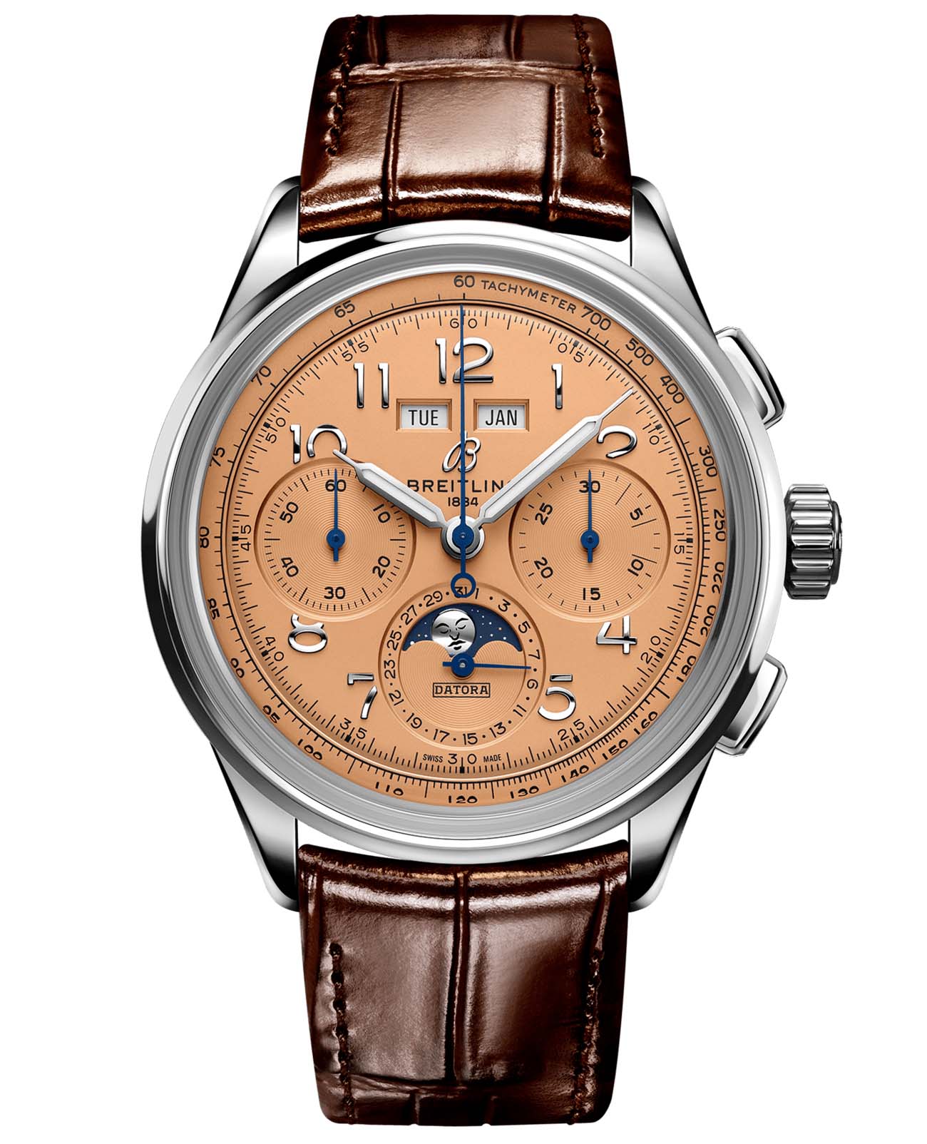Новое поколение хронографов Premier в невероятно элегантном исполнении демонстрирует высочайший уровень часового мастерства Breitling целым рядом сложных функций: Chronograph, Duograph и Datora. Помимо традиционных прямоугольных кнопок и арабских цифр хронографа, обновленная модель Premier обладает такими изящными элементами дизайна, как бороздки по бокам корпуса, прозрачная задняя крышка из сапфирового стекла и винтажные стрелки.