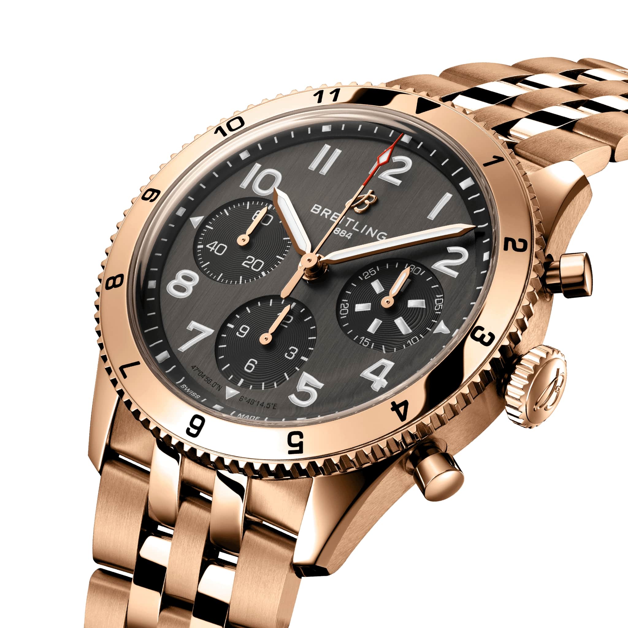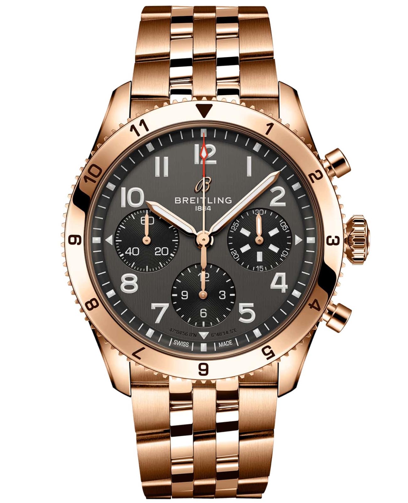 Корпус диаметром 42 мм выполнен из 18-каратного красного золота18-каратное золотоОбозначение по каратной системе пробирования, оно показывает, сколько драгоценного металла содержится в изделии. 18 карат - в составе 75% чистого золота, соответствует 750 пробе.