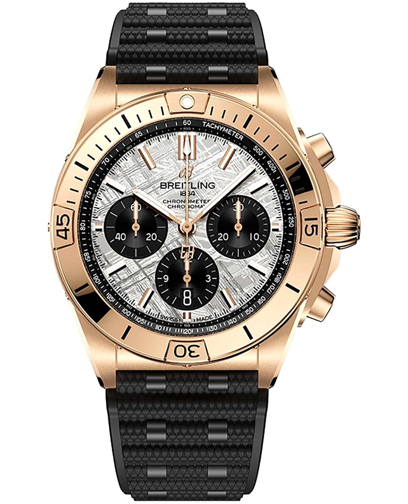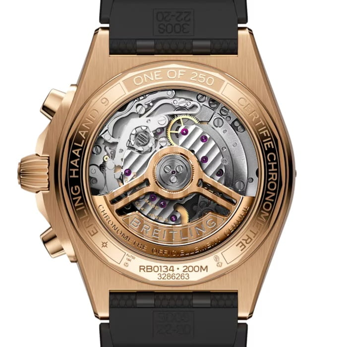 Универсальный хронометр Breitling Chronomat B01 42 Erling Haaland RB01347A1F1S1 выпущен ограниченным тиражом в 250 экземпляров в сотрудничестве с самим футболистом. Циферблат с черными дополнительными циферблатами вырезан из метеорита Муониалюста возрастом 4,5 миллиарда лет. На противовесе секундной стрелки хронографа выгравированы инициалы Эрлинга. Часы-хронографХронографФункция позволяет измерять отрезки времени с особой точностью: часы, минуты, секунды. Верным признаком хронографа является наличие на циферблате 3 дополнительных окошек-счётчиков. с секундомером и механическим механизмом (автоматический калибр) с высокой точностью. Циферблат защищен сапфировым стекломСапфировое стеклоПрочный и надёжный материал из кристалла сапфира синтетического происхождения, характеризующийся особой твёрдостью и устойчивостью к царапинам и повреждениям. с двусторонним антибликовым покрытиемАнтибликовое покрытиеСлой оксида металла в 0,13-0,3 микрон, благодаря которому стекло часов не бликует и не отражает свет. Антибликовое покрытие уменьшает отражение света в 10 раз, обеспечивая отличную читаемость показателей циферблата., устойчивым к повреждениям, а также дополнен безелемБезельВнешний ободок, закрепляющий стекло. В спортивных часах так называется поворотное кольцо с делениями на циферблате, выполняет роль таймера – замеряет отрезки времени на шкале. Неподвижный безель – элемент декора. Однонаправленно вращающийся безель на дайверских часах позволяет фиксировать моменты погружения и выныривания на поверхность.. Класс водозащиты: 200 метров позволит плавать, нырять и заниматься другими водными видами спорта. Корпус часов изготовлен из 18-каратного золота18-каратное золотоОбозначение по каратной системе пробирования, оно показывает, сколько драгоценного металла содержится в изделии. 18 карат - в составе 75% чистого золота, соответствует 750 пробе.