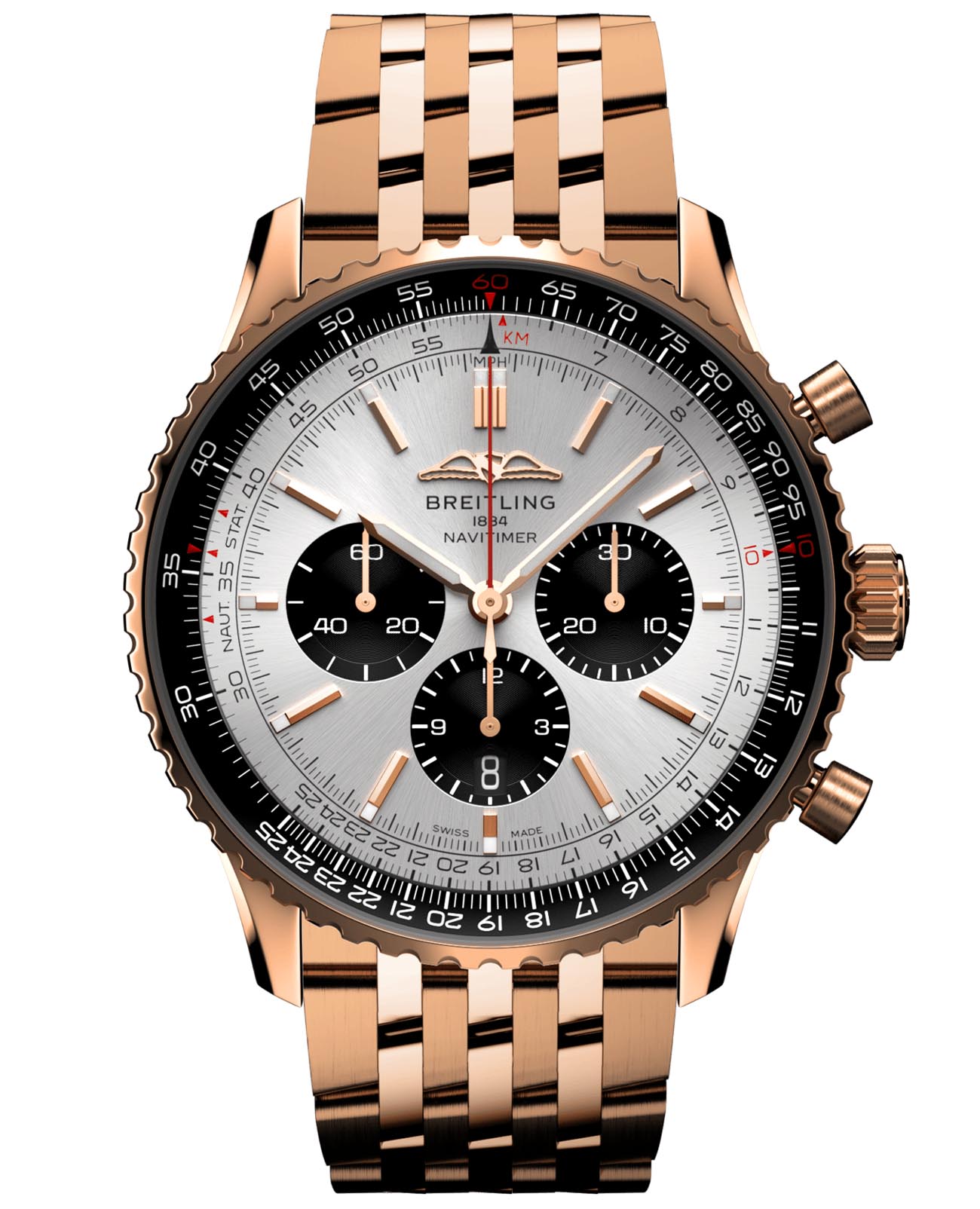 Мужские швейцарские часы-хронографХронографФункция позволяет измерять отрезки времени с особой точностью: часы, минуты, секунды. Верным признаком хронографа является наличие на циферблате 3 дополнительных окошек-счётчиков. с секундомеромСекундомерСекундоме́р — прибор, способный измерять интервалы времени с точностью до долей секунды. Breitling Navitimer B01 Chronograph 46 RB0137241G1R1, механический механизм (автоматический калибр) с высокой точностью. Сапфировое стеклоСапфировое стеклоПрочный и надёжный материал из кристалла сапфира синтетического происхождения, характеризующийся особой твёрдостью и устойчивостью к царапинам и повреждениям. устойчивое к появлению царапин, обладающее высокой прозрачностью. Класс водозащиты: 30 метров, позволит защитить корпус от случайных брызг или капель дождя. Корпус часов изготовлен из 18-каратного золота18-каратное золотоОбозначение по каратной системе пробирования, оно показывает, сколько драгоценного металла содержится в изделии. 18 карат - в составе 75% чистого золота, соответствует 750 пробе.