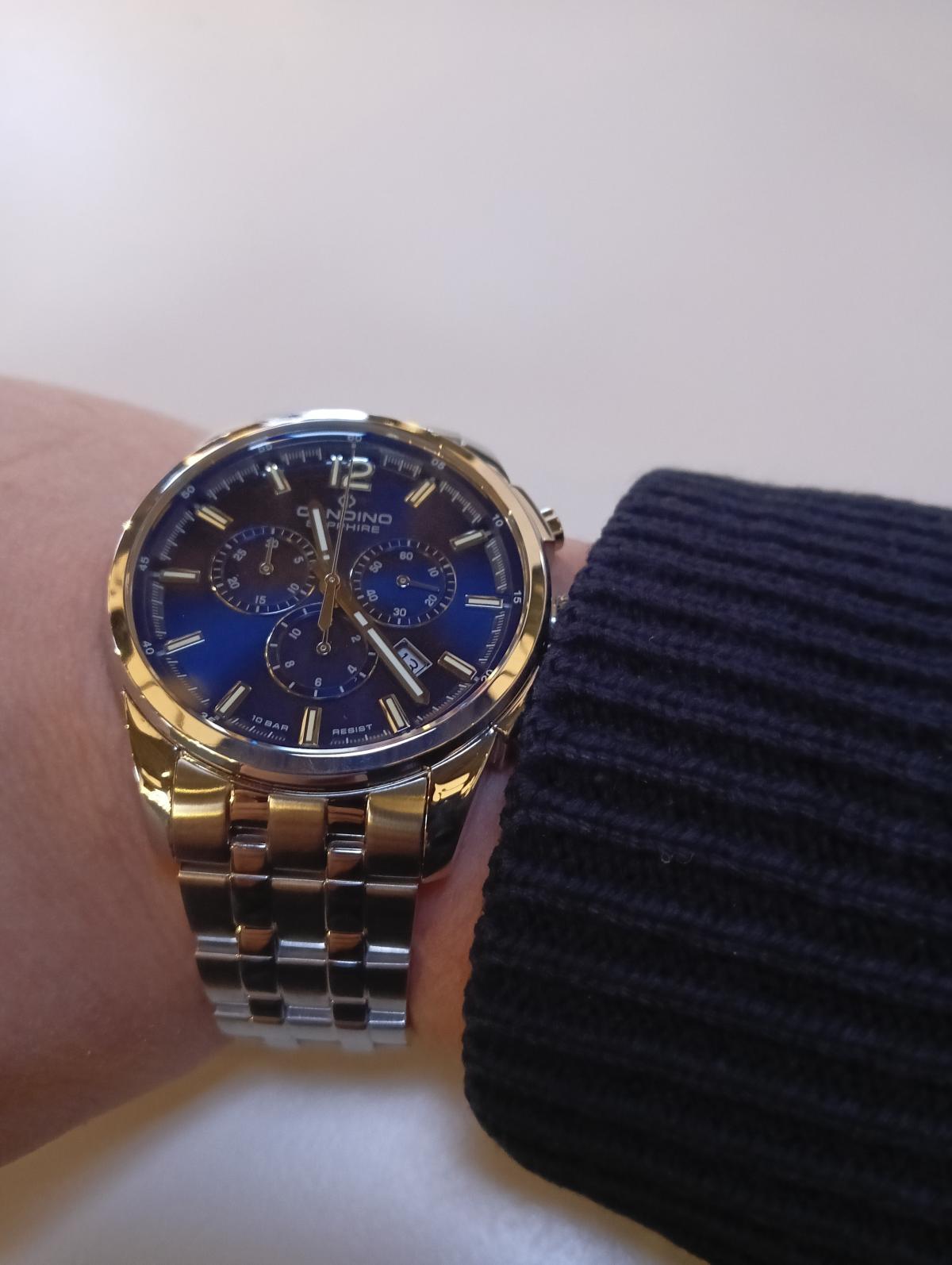 Швейцарские мужские наручные часы-хронографХронографФункция позволяет измерять отрезки времени с особой точностью: часы, минуты, секунды. Верным признаком хронографа является наличие на циферблате 3 дополнительных окошек-счётчиков. Candino Chronograph C4744/2, кварцевый механизм с высокой точностью. Сапфировое стеклоСапфировое стеклоПрочный и надёжный материал из кристалла сапфира синтетического происхождения, характеризующийся особой твёрдостью и устойчивостью к царапинам и повреждениям. устойчивое к появлению царапин, обладающее высокой прозрачностью. Часы, минуты, секунды. Окошко даты находится в положении между 4 и 5 часов. Класс водозащиты: 100 метров, позволит плавать, нырять и заниматься другими водными видами спорта. Раскладная застёжкаРаскладная застёжкаТакой тип застёжки используется только на браслетах из металла. Она никогда не раскрывается полностью, происходит разделение на 2 и более частей. Раскладывающая застёжка снизит вероятность потери часов к минимуму. с фиксатором. Корпус часов изготовлен из нержавеющей стали. Стрелки и метки с люминесцентным покрытиемЛюминесцентное покрытиеПозволяет считывать показания времени в темноте. Производители наносят на стрелки, часовые индексы, безель или поверхность циферблата светонакопительный состав, дающий холодное свечение..