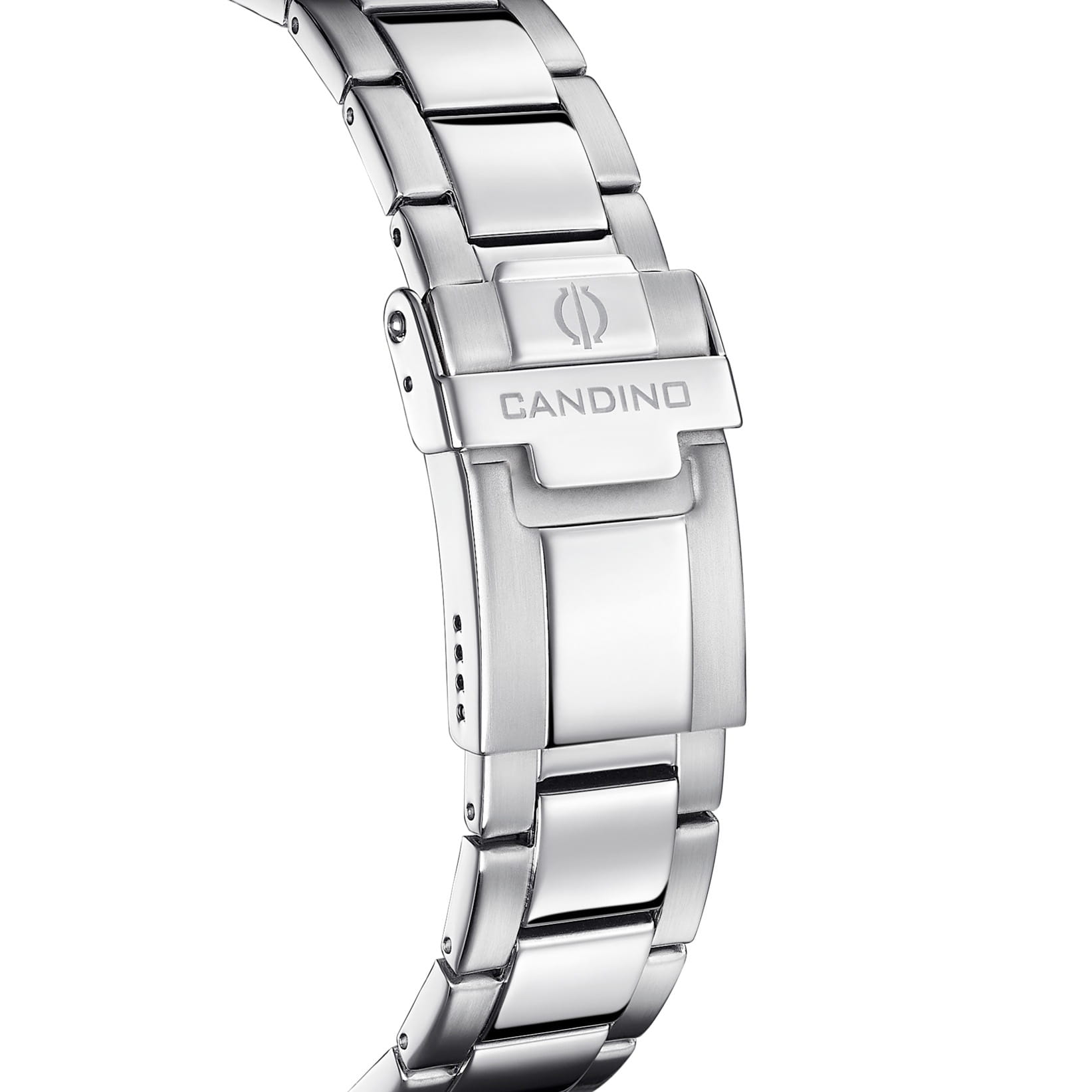 Мужские наручные часы-хронографХронографФункция позволяет измерять отрезки времени с особой точностью: часы, минуты, секунды. Верным признаком хронографа является наличие на циферблате 3 дополнительных окошек-счётчиков. Candino Gents Sport C4757/G сочетают в себе спортивный дизайн и надежность швейцарских технологий. Модель обладает круглым корпусом диаметром 45 мм, изготовленным из нержавеющей стали, что обеспечивает высокую устойчивость к коррозии и внешним воздействиям. Браслет выполнен из нержавеющей стали с раскладной застежкойРаскладная застёжкаТакой тип застёжки используется только на браслетах из металла. Она никогда не раскрывается полностью, происходит разделение на 2 и более частей. Раскладывающая застёжка снизит вероятность потери часов к минимуму., гарантирующей комфортное ношение и безопасность. Циферблат оснащен окном даты и функцией люминесцентного покрытияЛюминесцентное покрытиеПозволяет считывать показания времени в темноте. Производители наносят на стрелки, часовые индексы, безель или поверхность циферблата светонакопительный состав, дающий холодное свечение., что позволяет легко считывать показания времени даже в темноте. Для защиты используется сапфировое стеклоСапфировое стеклоПрочный и надёжный материал из кристалла сапфира синтетического происхождения, характеризующийся особой твёрдостью и устойчивостью к царапинам и повреждениям., обеспечивающее прочную защиту от царапин и долговечность. Часы работают на кварцевом механизме, проверенном годами качеством и точностью. Модель также является хронографом, оснащенным функцией секундомераСекундомерСекундоме́р — прибор, способный измерять интервалы времени с точностью до долей секунды., делая ее идеальной для активного образа жизни. Водонепроницаемость часов достигает 10 атмосфер (100 метров), что позволяет использовать их во время плавания и других водных видов спорта.