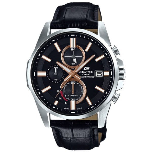 Стильные наручные кварцевые мужские часы на солнечной батарейке. Индикатор уровня заряда аккумулятора (Этот индикатор отображает текущий уровень заряда аккумулятора). Круглый корпус часов выполнены из высокопрочной стали. Черный фон циферблата с контрастными элементами дизайна. Водонепроницаемость часов составляет 10 ATM. Сапфировое стекло, устойчивое к появлению царапин. Часы надежно удерживаются на руке ремешком из натуральной кожи. Часы оснащены хронографом. Модный и современный аксессуар.