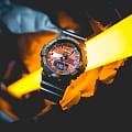 Дизайн модели умело комбинирует спортивные и fashion-элементы, чёрный матовый противоударный корпусУдаропрочный корпусМеханизм заключён в корпус, выполненный из современных материалов, устойчивых к ударам, механическим повреждениям и падению с высоты: инновационный пластик, карбон, нержавеющая сталь, титан. красиво обрамляет циферблат ярко-оранжевого цвета. По сравнению с часами серии GA-700, аксессуар получил уменьшенный размер корпуса, что положительно сказалось на комфортном ношении. Кварцевый калибр японского производства работает от батарейки, срок её службы составляет 3 года. Белая светодиодная подсветкаСветодиодная подсветкаСветодиодная или LED-подсветка обеспечивает появление яркого холодного свечения за счёт LED-элементов - маленьких лампочек. Они потребляют минимальное количество энергии, чаще всего можно встретить 1 светодиод, в нижней части циферблата. циферблата, стрелки с люминесцентным покрытиемЛюминесцентное покрытиеПозволяет считывать показания времени в темноте. Производители наносят на стрелки, часовые индексы, безель или поверхность циферблата светонакопительный состав, дающий холодное свечение.. Прочный полимерный ремешок. Водонепроницаемость 20 бар. Минеральное стекло. 12/24-часовое отображение времени. Секундомер с точностью в 1/100 секунды, мировое времяМировое время Полезное часовое усложнение, отображающее время в основных городах и известных областях по всему миру, оно связано с часовыми поясами, удобно для путешественников и бизнесменов. , таймер, будильник, календарь. Габариты: 54,1 x 48,6 x 15,5 мм.