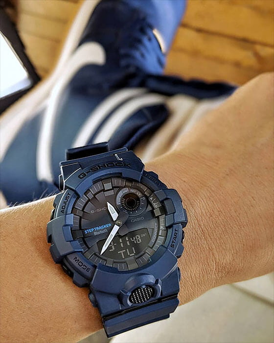 Часы в синем противоударном корпусеУдаропрочный корпусМеханизм заключён в корпус, выполненный из современных материалов, устойчивых к ударам, механическим повреждениям и падению с высоты: инновационный пластик, карбон, нержавеющая сталь, титан. и с минималистичным оформлением циферблата дополнят ваш образ динамичностью и брутальным характером. Модель не лишена функциональности, это первые часы G-Shock, оснащённые трекером активности. Также среди часовых усложнений BluetoothBluetoothСовременная технология, позволяющая синхронизировать часы с телефоном и переносить данные. Часы с Bluetooth расширяют возможности вашего смартфона и делают его использование ещё более удобным., таймер, секундомер, расчёт средней скорости пути, мировое времяМировое время Полезное часовое усложнение, отображающее время в основных городах и известных областях по всему миру, оно связано с часовыми поясами, удобно для путешественников и бизнесменов. , будильник, автоматический календарь. Срок службы батарейки - 2 года. Светодиодная подсветкаСветодиодная подсветкаСветодиодная или LED-подсветка обеспечивает появление яркого холодного свечения за счёт LED-элементов - маленьких лампочек. Они потребляют минимальное количество энергии, чаще всего можно встретить 1 светодиод, в нижней части циферблата. циферблата. Минеральное стекло. Корпус и браслет из полимерного материала. Водостойкость 20 бар. Габариты: 54,1 x 48,6 x 15,5 мм.