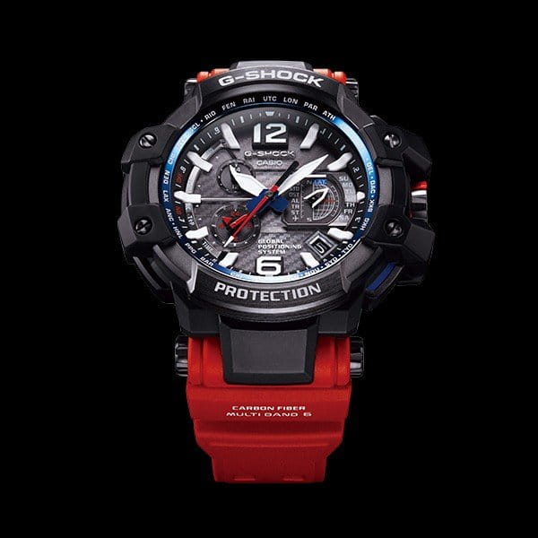 Флагманская модель с красным карбоновым ремешком из серии G-SHOCK GPW — это первые в мире часы с GPS- и радио-синхронизацией времени с атомными часами в разных частях света.