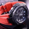 Брендовая модель серии G-Steel представлена в оригинальном исполнении, дизайнеры акцентировали внимание на внушительном безелеБезельВнешний ободок, закрепляющий стекло. В спортивных часах так называется поворотное кольцо с делениями на циферблате, выполняет роль таймера – замеряет отрезки времени на шкале. Неподвижный безель – элемент декора. Однонаправленно вращающийся безель на дайверских часах позволяет фиксировать моменты погружения и выныривания на поверхность. с IP-покрытиемIP-покрытиеМетод ионного напыления. Демонстрирует повышенную устойчивость к истиранию, окислению и химическим веществам. Под воздействием высокого давления и температуры около 1500°C молекулы металла надёжно соединяются с частицами корпуса часов.. Стильным дополнением стал красный каучуковый ремешок, обеспечивающий комфортное ношение. Это часы на солнечной батарее , позволяющие забыть о необходимости завода. Люминесцентная подсветкаЛюминесцентное покрытиеПозволяет считывать показания времени в темноте. Производители наносят на стрелки, часовые индексы, безель или поверхность циферблата светонакопительный состав, дающий холодное свечение. стрелок, яркая светодиодная подсветкаСветодиодная подсветкаСветодиодная или LED-подсветка обеспечивает появление яркого холодного свечения за счёт LED-элементов - маленьких лампочек. Они потребляют минимальное количество энергии, чаще всего можно встретить 1 светодиод, в нижней части циферблата. дисплея. Ударопрочный корпусУдаропрочный корпусМеханизм заключён в корпус, выполненный из современных материалов, устойчивых к ударам, механическим повреждениям и падению с высоты: инновационный пластик, карбон, нержавеющая сталь, титан. из пластика и хирургической стали 316L. Водостойкость 20 бар. Таймер, секундомер, будильник, мировое времяМировое время Полезное часовое усложнение, отображающее время в основных городах и известных областях по всему миру, оно связано с часовыми поясами, удобно для путешественников и бизнесменов. , автоматический календарь, приём радиосигнала для корректировки времени, хронографХронографФункция позволяет измерять отрезки времени с особой точностью: часы, минуты, секунды. Верным признаком хронографа является наличие на циферблате 3 дополнительных окошек-счётчиков.. Габариты: 55,9 x 49,3 x 15,3 мм.