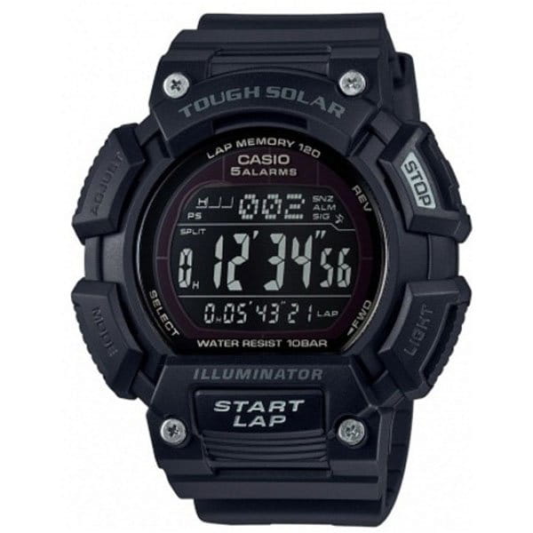 Спортивные японские часы на солнечной батареи.  Функция автоматического сохранения энергии. Время работы аккумулятора без подзарядки - 11 месяцев, при включенной функции сохранения энергии - 38 месяцев. Секундомер с точностью показаний 1/100с и временем измерения 100ч. Сплит-хронограф. Память на 120 этапов. Номер и лучшее время этапа. Два таймера обратного отсчета времени от 5с до 100мин с устанавливаемым количеством повторов от 1 до 10. Мировое время. 12-ти и 24-х часовой формат времени. Функция включения/отключения звука.