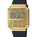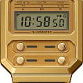 Японские наручные часы с хронографом Casio Vintage A100WEFG-9AEF, кварцевый механизм с высокой точностью. Класс водозащиты: 30 метров, позволит защитить корпус от случайных брызг или капель дождя. Корпус часов изготовлен из пластика, золотого цвета. Часы являются копией модели F-100, которая была первой моделью Casio в пластиковом корпусе. Отличительной чертой часов являются 4 кнопки на лицевой панели. ХронографХронографФункция позволяет измерять отрезки времени с особой точностью: часы, минуты, секунды. Верным признаком хронографа является наличие на циферблате 3 дополнительных окошек-счётчиков.. Циферблат подсвечивается светодиодом. Цвет подсветки: оранжевый. СекундомерСекундомерСекундоме́р — прибор, способный измерять интервалы времени с точностью до долей секунды. с точностью показаний 1/10с и временем измерения 1ч. Батарея рассчитана на 3 года. Водонепроницаемость в соответствии с DIN 8310/ISO 2281. Ремешок с классической застежкой.
