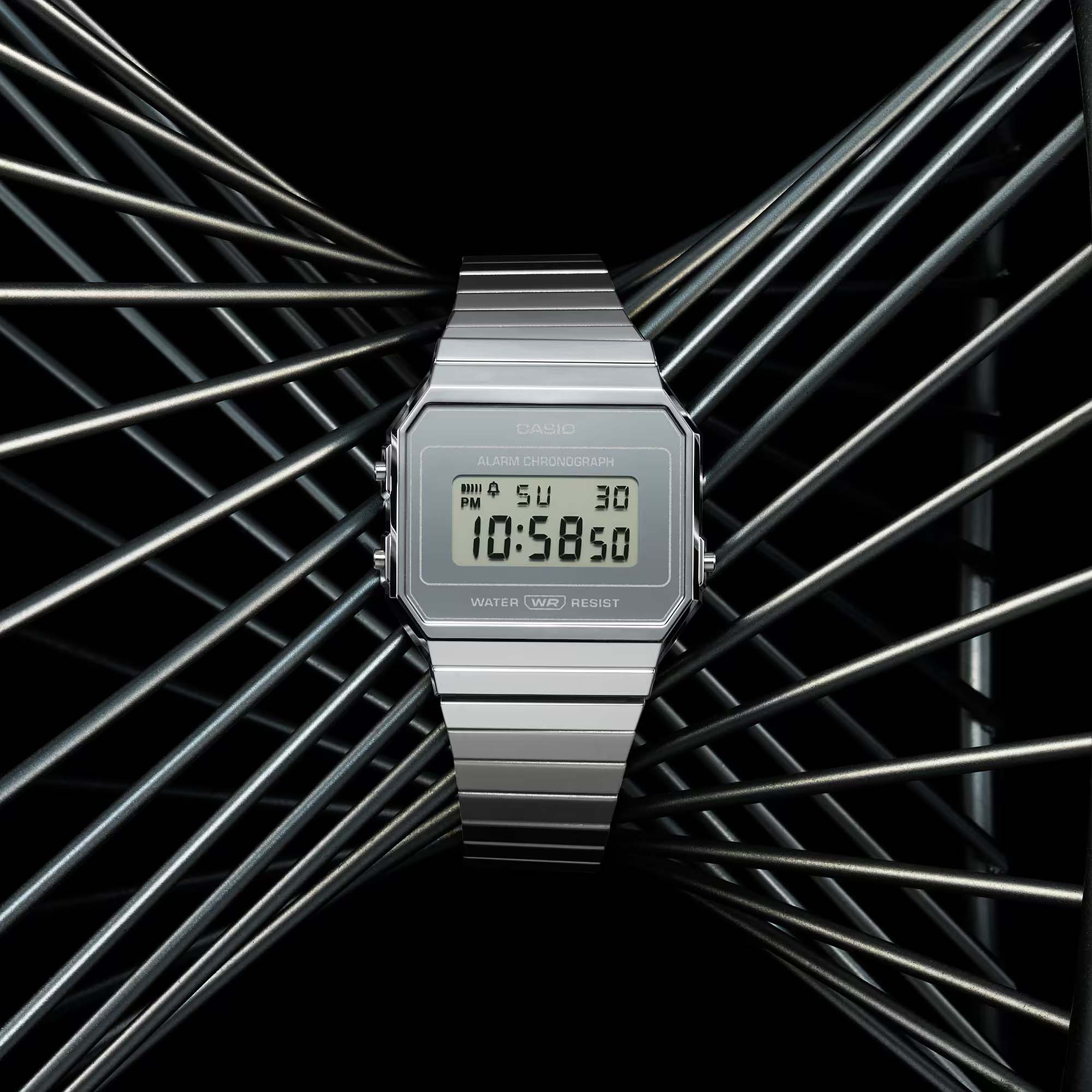 Спортивные японские мужские часы с секундомеромСекундомерСекундоме́р — прибор, способный измерять интервалы времени с точностью до долей секунды. Casio Vintage A700WEV-7A, кварцевый механизм с высокой точностью. Издавая звуковой сигнал в установленное время, будильникБудильникБуди́льник — часы, в заданный момент времени подающие звуковой, световой и/или в редких случаях другой сигнал. напоминает о событиях, которые повторяются каждый день. Корпус из полимерного пластика. Класс водозащиты: 30 метров, позволит защитить корпус от случайных брызг или капель дождя. Браслет из нержавеющей стали на раскладной застёжкеРаскладная застёжкаТакой тип застёжки используется только на браслетах из металла. Она никогда не раскрывается полностью, происходит разделение на 2 и более частей. Раскладывающая застёжка снизит вероятность потери часов к минимуму..
