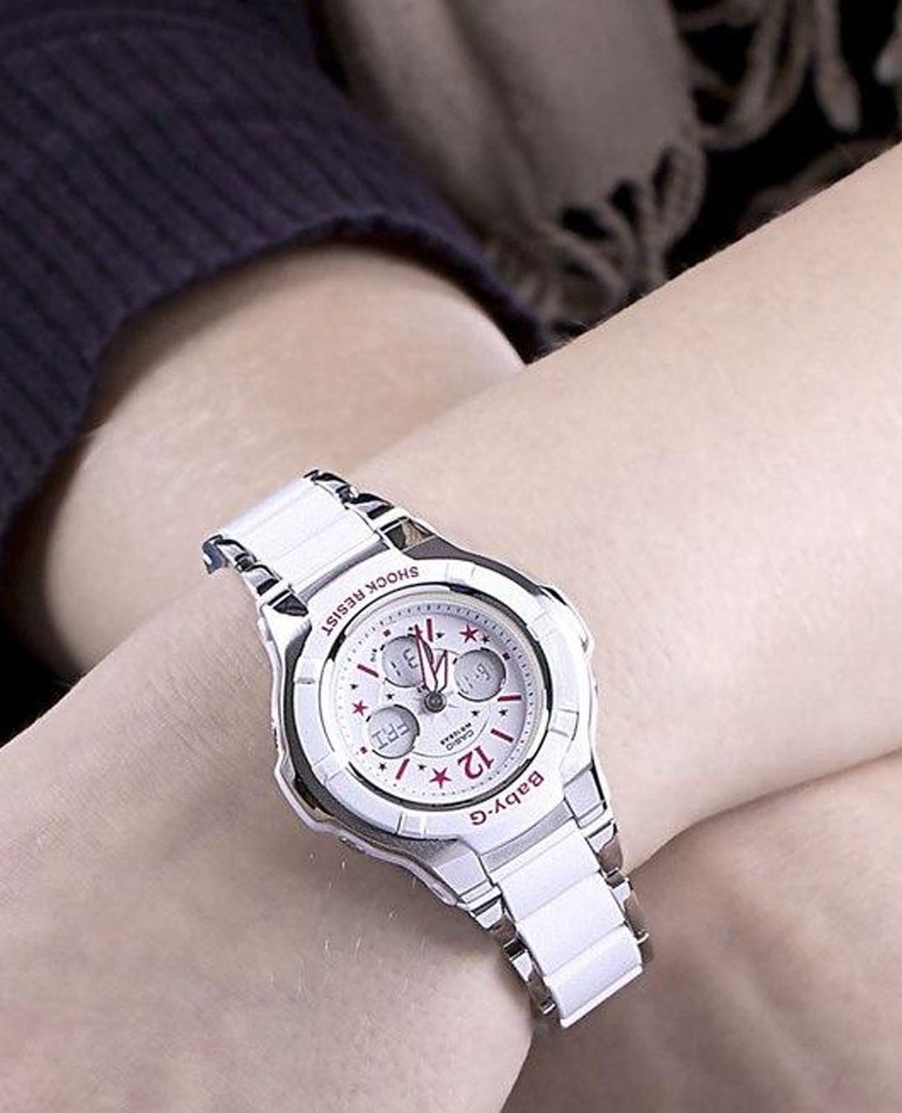 Японские женские часы-хронографХронографФункция позволяет измерять отрезки времени с особой точностью: часы, минуты, секунды. Верным признаком хронографа является наличие на циферблате 3 дополнительных окошек-счётчиков. Casio Baby-G BGA-120C-7B2 из коллекции Baby-G. Серия, которая выражает спортивность и цвет, которые являются основой бренда Baby-G. Минеральное стеклоМинеральное стеклоМинеральное стекло представляет собой искусственно выращенный минерал кварца. Такое стекло отличается особой устойчивостью к повреждениям и царапинам. Уступает по некоторым качествам сапфировому стеклу. устойчивое к появлению царапин, обладающее высокой прозрачностью. Корпус часов изготовлен из стали с пластиком. Функции: автоматическая светодиодная подсветка.Необритовое покрытиеПодсветка NeobriteИспользование светонакопительных составов на основе сульфида цинка или алюмината стронция, яркий свет можно наблюдать на протяжении 6-10 часов после «зарядки» часов около источника света. продолжает светиться в темноте даже после непродолжительного пребывания на свету.Ударопрочный корпусУдаропрочный корпусМеханизм заключён в корпус, выполненный из современных материалов, устойчивых к ударам, механическим повреждениям и падению с высоты: инновационный пластик, карбон, нержавеющая сталь, титан. защищает механизм от ударов и вибрации. Функция Мирового времениМировое время Полезное часовое усложнение, отображающее время в основных городах и известных областях по всему миру, оно связано с часовыми поясами, удобно для путешественников и бизнесменов. . СекундомерСекундомерСекундоме́р — прибор, способный измерять интервалы времени с точностью до долей секунды. с точностью измерения 1/100 секунды и измерением до 23 часов 59 минут 59,99 cек. ТаймерТаймерОтсчитывает секунды в обратном направлении в заданном интервале времени. обратного отсчета (диапазон времени 24 часа), автоматический календарь, 12/24 отображение времени. 5 ежедневных будильниковБудильникБуди́льник — часы, в заданный момент времени подающие звуковой, световой и/или в редких случаях другой сигнал.. Класс водозащиты: 100 метров, позволит плавать без погружения. Браслет из стали с пластиковыми вставками на раскладной застёжкеРаскладная застёжкаТакой тип застёжки используется только на браслетах из металла. Она никогда не раскрывается полностью, происходит разделение на 2 и более частей. Раскладывающая застёжка снизит вероятность потери часов к минимуму..