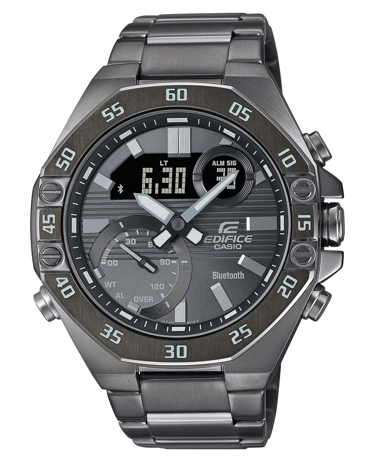 Casio Edifice ECB-10DC-1B – современные мужские часы, сочетающие спортивный дизайн и передовые технологии. Корпус размером 51×48,5 мм и толщиной 12,5 мм выполнен из нержавеющей стали с IP-покрытиемIP-покрытиеМетод ионного напыления. Демонстрирует повышенную устойчивость к истиранию, окислению и химическим веществам. Под воздействием высокого давления и температуры около 1500°C молекулы металла надёжно соединяются с частицами корпуса часов. серого цвета, обеспечивая прочность и устойчивость к коррозии. Серый циферблат с аналогово-цифровым отображением времени защищён минеральным стекломМинеральное стеклоМинеральное стекло представляет собой искусственно выращенный минерал кварца. Такое стекло отличается особой устойчивостью к повреждениям и царапинам. Уступает по некоторым качествам сапфировому стеклу., устойчивым к царапинам.