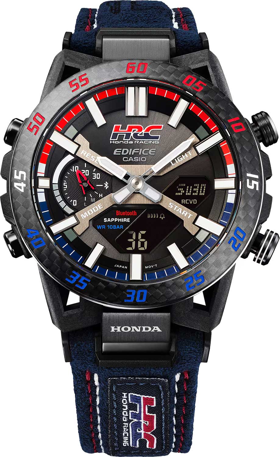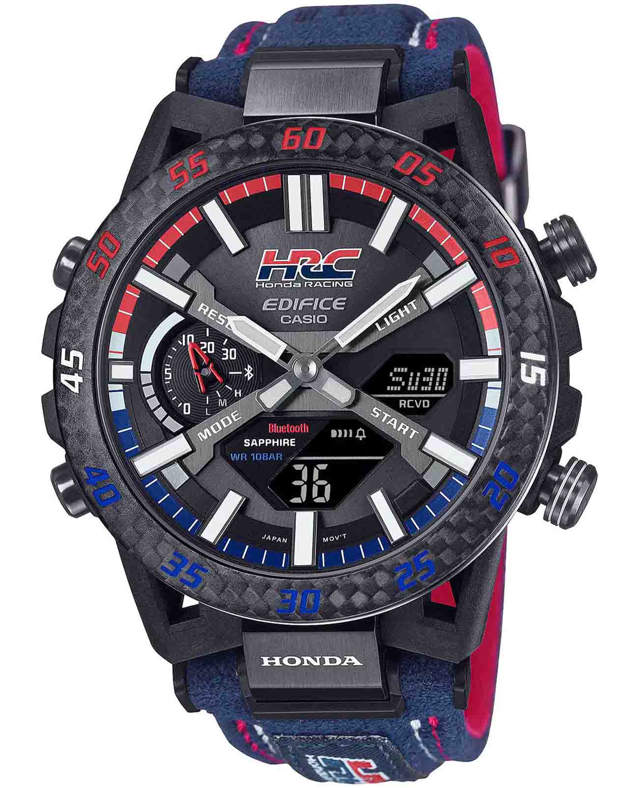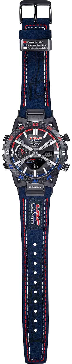 Модель Casio Edifice ECB-2000HR-1A из коллекции Edifice сочетает передовые технологии и динамичный спортивный стиль. Корпус выполнен из углеродного волокнаCarbon Core Guard Новейшая структура корпуса, разработанная Casio. Полиуретановая пластина дополнительно усилена карбоновыми вставками, что придаёт специальную защиту от механических повреждений. Карбон отличается лёгкостью и прочностью., усиленного смолой, что обеспечивает прочность и легкость и стальной безельБезельВнешний ободок, закрепляющий стекло. В спортивных часах так называется поворотное кольцо с делениями на циферблате, выполняет роль таймера – замеряет отрезки времени на шкале. Неподвижный безель – элемент декора. Однонаправленно вращающийся безель на дайверских часах позволяет фиксировать моменты погружения и выныривания на поверхность. с PVD-покрытиемPVDУльтратонкое покрытие наносится в технике вакуумного напыления, сочетает в себе нитрид титана особой прочности со слоем золота или оксида хрома. Несёт в себе декоративную или защитную функцию.. Циферблат с металлическими метками и объемными элементами подчеркивает автоспортивный характер модели. Часы оснащены Bluetooth®-синхронизациейBluetoothСовременная технология, позволяющая синхронизировать часы с телефоном и переносить данные. Часы с Bluetooth расширяют возможности вашего смартфона и делают его использование ещё более удобным., позволяющей автоматически корректировать время, управлять мировым временемМировое время Полезное часовое усложнение, отображающее время в основных городах и известных областях по всему миру, оно связано с часовыми поясами, удобно для путешественников и бизнесменов. и передавать данные секундомера через приложение CASIO WATCHES. Солнечная батарея Tough SolarTough SolarТехнология основана на подзарядке аккумулятора от источника солнечного света, специальная панель улавливает солнечные лучи и преобразует их в энергию для работы часов. Достаточно пары минут нахождения на солнце для функционирования часов в течении суток. преобразует свет в энергию, обеспечивая бесперебойную работу. Дополнительные функции включают таймер обратного отсчетаТаймерОтсчитывает секунды в обратном направлении в заданном интервале времени. с индикатором на отметке 9 часов, будильникБудильникБуди́льник — часы, в заданный момент времени подающие звуковой, световой и/или в редких случаях другой сигнал., секундомерСекундомерСекундоме́р — прибор, способный измерять интервалы времени с точностью до долей секунды. и двойную светодиодную подсветку Super IlluminatorСветодиодная подсветкаСветодиодная или LED-подсветка обеспечивает появление яркого холодного свечения за счёт LED-элементов - маленьких лампочек. Они потребляют минимальное количество энергии, чаще всего можно встретить 1 светодиод, в нижней части циферблата. для удобного чтения показаний в темноте. Кожаный ремешок на стандартной застёжке. Водонепроницаемость до 100 метров делает модель подходящей для плавания и активного образа жизни. Edifice Sospensione x HRC Honda Racing. Модель отдает дань уважения захватывающим победам команды Honda Racing Corporation (HRC). Дизайн вдохновлен подвеской болида Формулы-1. Ушки часов разработаны по схеме четырехрычажной подвески гоночного автомобиля. Красные, синие и белые элементы, присутствующие в дизайне часов символизируют гордый гоночный дух. Значение каждого цвета 