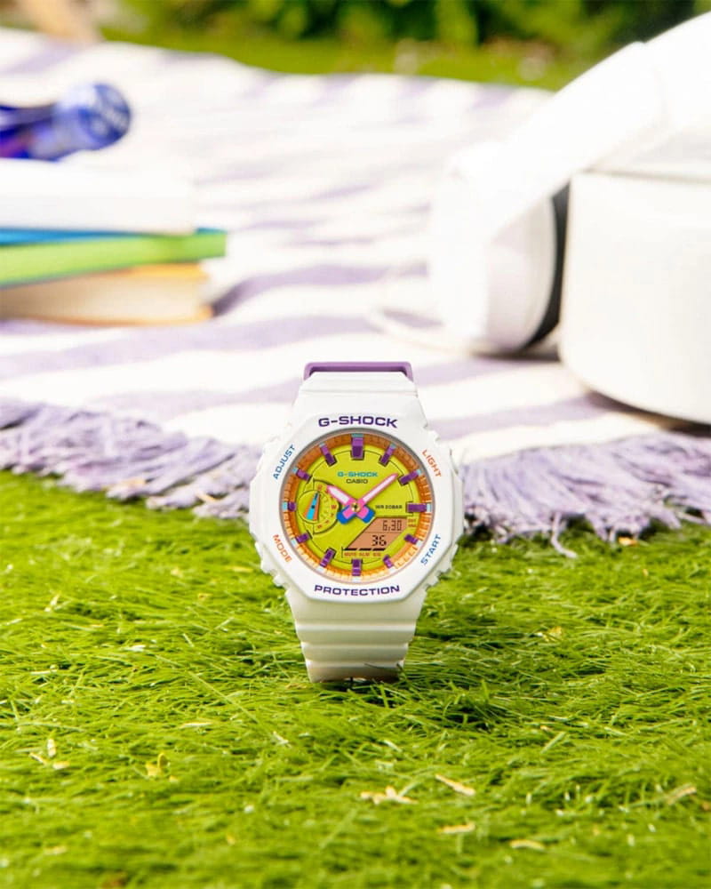 Японские женские часы-хронографХронографФункция позволяет измерять отрезки времени с особой точностью: часы, минуты, секунды. Верным признаком хронографа является наличие на циферблате 3 дополнительных окошек-счётчиков. Casio G-Shock GMA-S2100BS-7ADR (GMA-S2100BS-7A) из коллекции G-Shock. Минеральное стеклоМинеральное стеклоМинеральное стекло представляет собой искусственно выращенный минерал кварца. Такое стекло отличается особой устойчивостью к повреждениям и царапинам. Уступает по некоторым качествам сапфировому стеклу. устойчивое к появлению царапин, обладающее высокой прозрачностью. Ударопрочный корпусУдаропрочный корпусМеханизм заключён в корпус, выполненный из современных материалов, устойчивых к ударам, механическим повреждениям и падению с высоты: инновационный пластик, карбон, нержавеющая сталь, титан. защищает механизм от ударов и вибрации. Светодиодная автоподсветка NeobriteПодсветка NeobriteИспользование светонакопительных составов на основе сульфида цинка или алюмината стронция, яркий свет можно наблюдать на протяжении 6-10 часов после «зарядки» часов около источника света. - при повороте часов в сторону лица подсветка дисплея осуществляется автоматически. Настраиваемое послесвечение 1,5 или 3сек. Мировое времяМировое время Полезное часовое усложнение, отображающее время в основных городах и известных областях по всему миру, оно связано с часовыми поясами, удобно для путешественников и бизнесменов. – 48 городов (29 часовых поясов). СекундомерСекундомерСекундоме́р — прибор, способный измерять интервалы времени с точностью до долей секунды. с точностью измерения 1/100 секунды и измерением до 23 часов 59 минут 59,99 cек. ТаймерТаймерОтсчитывает секунды в обратном направлении в заданном интервале времени. обратного отсчета (диапазон времени 24 часа), автоматический календарь, 12/24 отображение времени. 5 будильниковБудильникБуди́льник — часы, в заданный момент времени подающие звуковой, световой и/или в редких случаях другой сигнал., ежечасный сигнал. Переключение между домашним и мировым временем. Класс водозащиты: 200 метров, позволит плавать, нырять и заниматься другими водными видами спорта. Ремешок из полимерного материала на стандартной застежке.