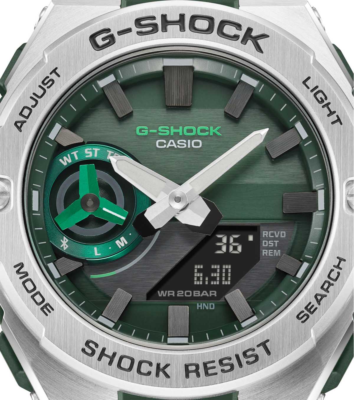 Японские мужские часы-хронографХронографФункция позволяет измерять отрезки времени с особой точностью: часы, минуты, секунды. Верным признаком хронографа является наличие на циферблате 3 дополнительных окошек-счётчиков. с минеральным стекломМинеральное стеклоМинеральное стекло представляет собой искусственно выращенный минерал кварца. Такое стекло отличается особой устойчивостью к повреждениям и царапинам. Уступает по некоторым качествам сапфировому стеклу. Casio G-Shock GST-B500AD-3A, кварцевый механизм с высокой точностью. Линейка GST-B500 объединяет в себе все самое необходимое, что нужно современным мужчинам. Питание от солнечной энергии Tough SolarTough SolarТехнология основана на подзарядке аккумулятора от источника солнечного света, специальная панель улавливает солнечные лучи и преобразует их в энергию для работы часов. Достаточно пары минут нахождения на солнце для функционирования часов в течении суток. солнечные батарейки большой мощности, индикатор заряда батареи. Функция автоматического сохранения энергии. Время работы аккумулятора без подзарядки приблизительно 7 месяцев, при включенной функции сохранения энергии приблизительно 18 месяцев. Механизм часов помещен в корпус из прочного материала, который надежно защищает от внешних воздействий, от ударов и вибрации. Carbon Core GuardCarbon Core Guard Новейшая структура корпуса, разработанная Casio. Полиуретановая пластина дополнительно усилена карбоновыми вставками, что придаёт специальную защиту от механических повреждений. Карбон отличается лёгкостью и прочностью. объединяет корпус и заднюю крышку в единый карбоновый моноблок. Ударопрочный корпусУдаропрочный корпусМеханизм заключён в корпус, выполненный из современных материалов, устойчивых к ударам, механическим повреждениям и падению с высоты: инновационный пластик, карбон, нержавеющая сталь, титан. из стали и полимерного материала защищает механизм от ударов и вибрации. Двойная светодиодная белая подсветка Super Illuminator с функцией Afterglow, одновременно подсвечивается аналоговый циферблат и цифровой дисплей. Светонакопительное покрытие NeobriteПодсветка NeobriteИспользование светонакопительных составов на основе сульфида цинка или алюмината стронция, яркий свет можно наблюдать на протяжении 6-10 часов после «зарядки» часов около источника света. обеспечивает длительное послесвечение в темноте даже после кратковременного нахождения на свету. Сплит-хронографСплит-хронографИспользуется для измерения продолжительности нескольких временных отрезков, начинающихся одновременно, а заканчивающихся в разное время.. ТаймерТаймерОтсчитывает секунды в обратном направлении в заданном интервале времени. обратного отсчета от 1 секунды до 1 часа. Мировое времяМировое время Полезное часовое усложнение, отображающее время в основных городах и известных областях по всему миру, оно связано с часовыми поясами, удобно для путешественников и бизнесменов. – 38 часовых поясов, всемирное координированное время (UTCUTCВсемирное кординационное время, не имеющее привязки к географическому положению Гринвича, основывается на атомном отсчёте времени. Регулировка времени осуществляется более точно, чем устаревшее GMT.