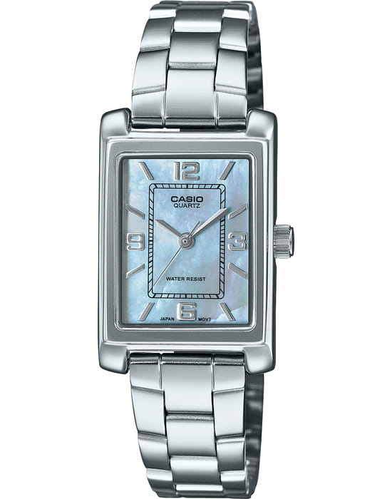 Casio LTP-1234DS-2A — женские часы с элегантным прямоугольным корпусом, сочетающие классический дизайн и практичность. Корпус из нержавеющей стали имеет размеры 32 × 21 мм и толщину всего 7,4 мм, благодаря чему модель смотрится утончённо и удобно сидит на запястье. Циферблат выполнен из перламутра, что придаёт ему мягкое сияние и глубину. Лаконичная разметка и тонкие стрелки подчёркивают изысканность модели. Поверхность защищена прочным минеральным стекломМинеральное стеклоМинеральное стекло представляет собой искусственно выращенный минерал кварца. Такое стекло отличается особой устойчивостью к повреждениям и царапинам. Уступает по некоторым качествам сапфировому стеклу., устойчивым к царапинам и сохраняющим безупречный внешний вид. Точный кварцевый механизм обеспечивает стабильный ход и не требует подзавода. Питание осуществляется от батарейки с ресурсом до 3 лет. Браслет из нержавеющей стали оснащён удобной раскладной застёжкойРаскладная застёжкаТакой тип застёжки используется только на браслетах из металла. Она никогда не раскрывается полностью, происходит разделение на 2 и более частей. Раскладывающая застёжка снизит вероятность потери часов к минимуму., которая обеспечивает надёжную фиксацию и лёгкость в использовании. Водозащита уровня WR позволяет не бояться случайных брызг или дождя. LTP-1234DS-2A — утончённая модель для повседневной носки, сочетающая в себе надёжность, комфорт и классическую элегантность.
