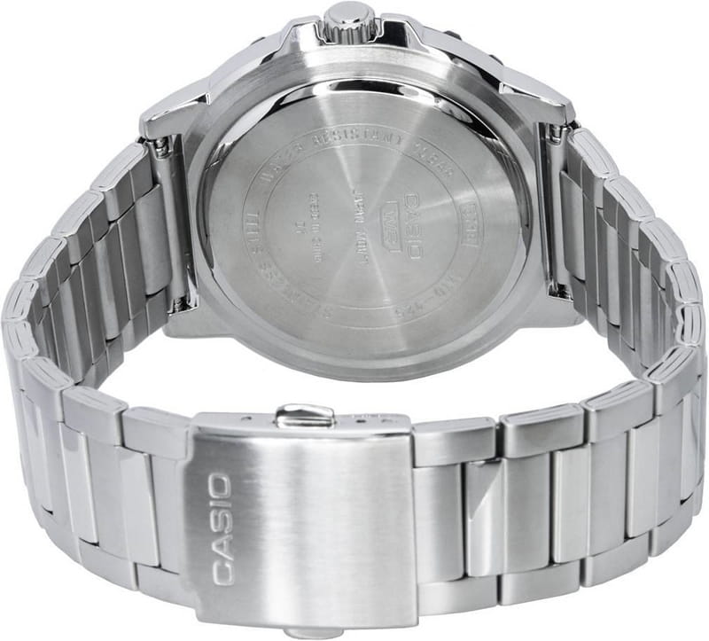Мужские японские часы Casio MTD-125D-3A, кварцевый механизм с высокой точностью. Класс водозащиты: 100 метров. Круглый стальной корпус изготовлен из нержавеющей стали и алюминия.Поворотный безельБезельВнешний ободок, закрепляющий стекло. В спортивных часах так называется поворотное кольцо с делениями на циферблате, выполняет роль таймера – замеряет отрезки времени на шкале. Неподвижный безель – элемент декора. Однонаправленно вращающийся безель на дайверских часах позволяет фиксировать моменты погружения и выныривания на поверхность. из стали с пластиковой вставкой. Окошко даты на отметке 3 часа. Рифленая заводная головка. Стальной браслет на раскладной застёжкеРаскладная застёжкаТакой тип застёжки используется только на браслетах из металла. Она никогда не раскрывается полностью, происходит разделение на 2 и более частей. Раскладывающая застёжка снизит вероятность потери часов к минимуму..