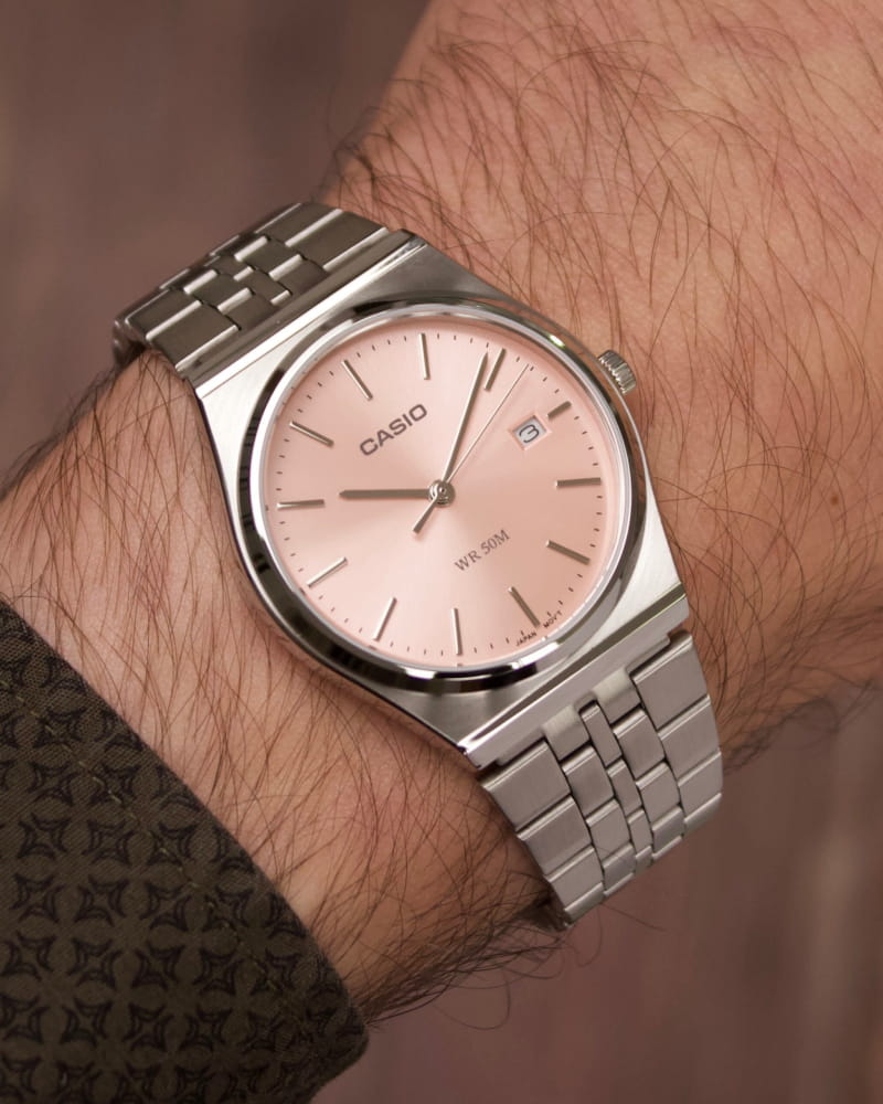 Японские мужские часы с минеральным стекломМинеральное стеклоМинеральное стекло представляет собой искусственно выращенный минерал кварца. Такое стекло отличается особой устойчивостью к повреждениям и царапинам. Уступает по некоторым качествам сапфировому стеклу. Casio Collection MTP-B145D-4A, кварцевый механизм с высокой точностью. Корпус часов изготовлен из стали. Циферблат с метками в виде штрихов выполнен по технологии Sunray (солнечные лучи). Окошко даты находится в положении 3 часа. Батарейка рассчитана на 3 года. Класс водозащиты: 50 метров, позволит защитить корпус от случайных брызг или капель дождя. Стальной браслет на раскладной застёжкеРаскладная застёжкаТакой тип застёжки используется только на браслетах из металла. Она никогда не раскрывается полностью, происходит разделение на 2 и более частей. Раскладывающая застёжка снизит вероятность потери часов к минимуму..