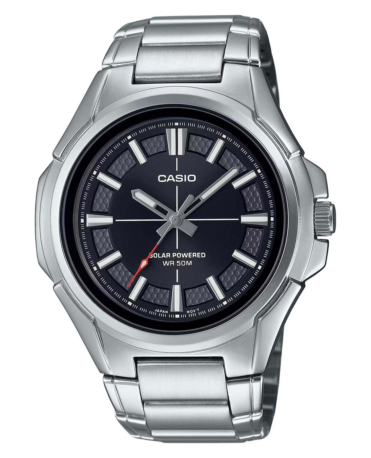 Японские мужские кварцевые часы с минеральным стекломМинеральное стеклоМинеральное стекло представляет собой искусственно выращенный минерал кварца. Такое стекло отличается особой устойчивостью к повреждениям и царапинам. Уступает по некоторым качествам сапфировому стеклу. Casio Collection MTP-RS100D-1A, кварцевый механизм с высокой точностью. Корпус часов изготовлен из нержавеющей стали. Питание от солнечной энергии. Время работы - 4 месяца. Циферблат с метками в виде штрихов выполнен по технологии Sunray (солнечные лучи). Циферблат с метками в виде штрихов. Стрелки и метки с люминесцентным покрытиемЛюминесцентное покрытиеПозволяет считывать показания времени в темноте. Производители наносят на стрелки, часовые индексы, безель или поверхность циферблата светонакопительный состав, дающий холодное свечение.. Заводная головка с защитой. Класс водозащиты: 50 метров, позволит защитить корпус от случайных брызг или капель дождя. Стальной браслет на раскладной застёжкеРаскладная застёжкаТакой тип застёжки используется только на браслетах из металла. Она никогда не раскрывается полностью, происходит разделение на 2 и более частей. Раскладывающая застёжка снизит вероятность потери часов к минимуму..