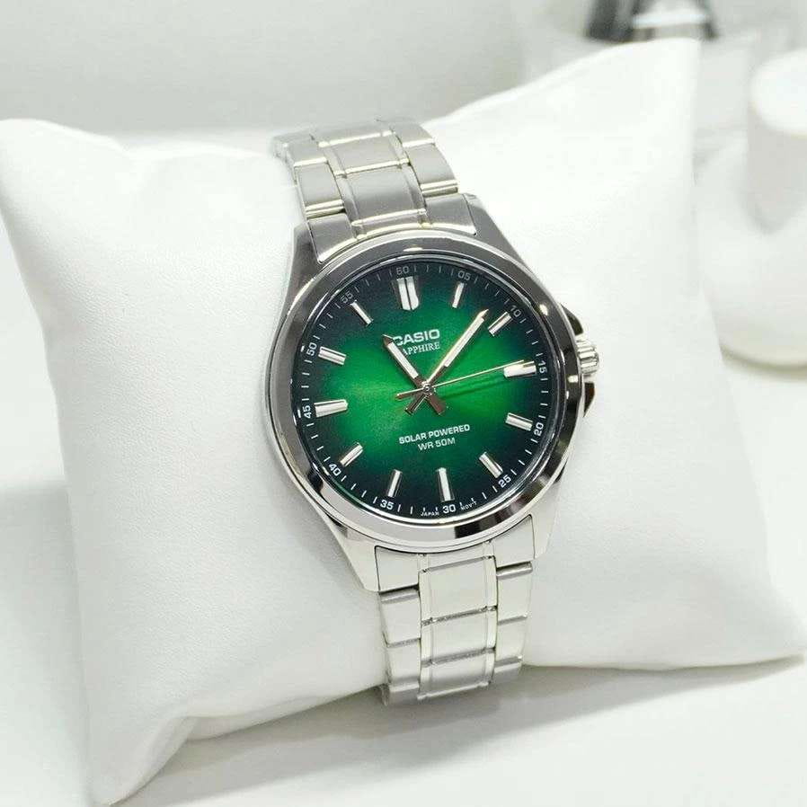 Мужские кварцевые часы Casio Collection — это современный и практичный аксессуар с питанием от солнечной энергии. Корпус размером 41,7 мм и толщиной 9,5 мм выполнен из нержавеющей стали. Циферблат зелёного цвета оформлен штрихами и стрелками. Циферблат защищён сапфировым стекломСапфировое стеклоПрочный и надёжный материал из кристалла сапфира синтетического происхождения, характеризующийся особой твёрдостью и устойчивостью к царапинам и повреждениям. с антибликовым покрытиемАнтибликовое покрытиеСлой оксида металла в 0,13-0,3 микрон, благодаря которому стекло часов не бликует и не отражает свет. Антибликовое покрытие уменьшает отражение света в 10 раз, обеспечивая отличную читаемость показателей циферблата.. Механизм — японский кварцевый калибр Miyota с центральной секундной стрелкой. Часы оснащены стальным браслетом из нержавеющей стали на раскладной застёжкеРаскладная застёжкаТакой тип застёжки используется только на браслетах из металла. Она никогда не раскрывается полностью, происходит разделение на 2 и более частей. Раскладывающая застёжка снизит вероятность потери часов к минимуму.. Заводная головка с защитой повышает надёжность. Водонепроницаемость 50 м позволяет использовать часы при мытье рук или в дождь. Идеальный выбор для тех, кто ценит японское качество и универсальный дизайн.