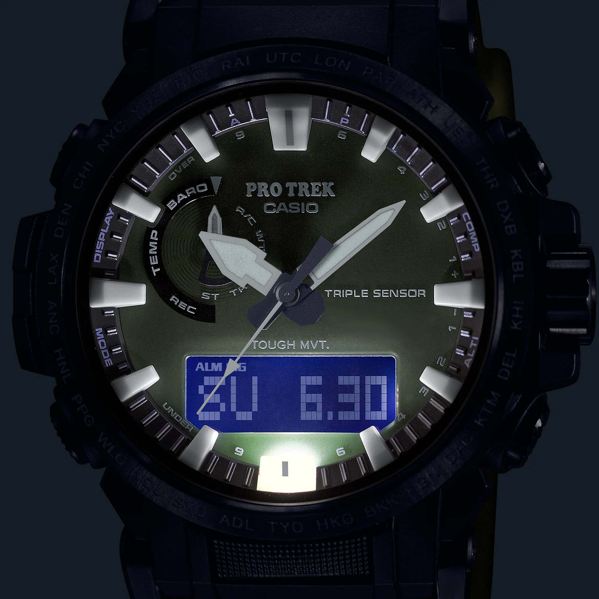 Флагманский аксессуар с аналого-цифровым дисплеем. Ни одна туристическая вылазка не обойдётся без этих часов, ведь они оснащены барометром, термометром -10°C /+60°C, альтиметром, цифровым компасом, хронографомХронографФункция позволяет измерять отрезки времени с особой точностью: часы, минуты, секунды. Верным признаком хронографа является наличие на циферблате 3 дополнительных окошек-счётчиков., таймером, функцией мирового времениМировое время Полезное часовое усложнение, отображающее время в основных городах и известных областях по всему миру, оно связано с часовыми поясами, удобно для путешественников и бизнесменов. – 29 часовых поясов и UTCUTCВсемирное кординационное время, не имеющее привязки к географическому положению Гринвича, основывается на атомном отсчёте времени. Регулировка времени осуществляется более точно, чем устаревшее GMT.