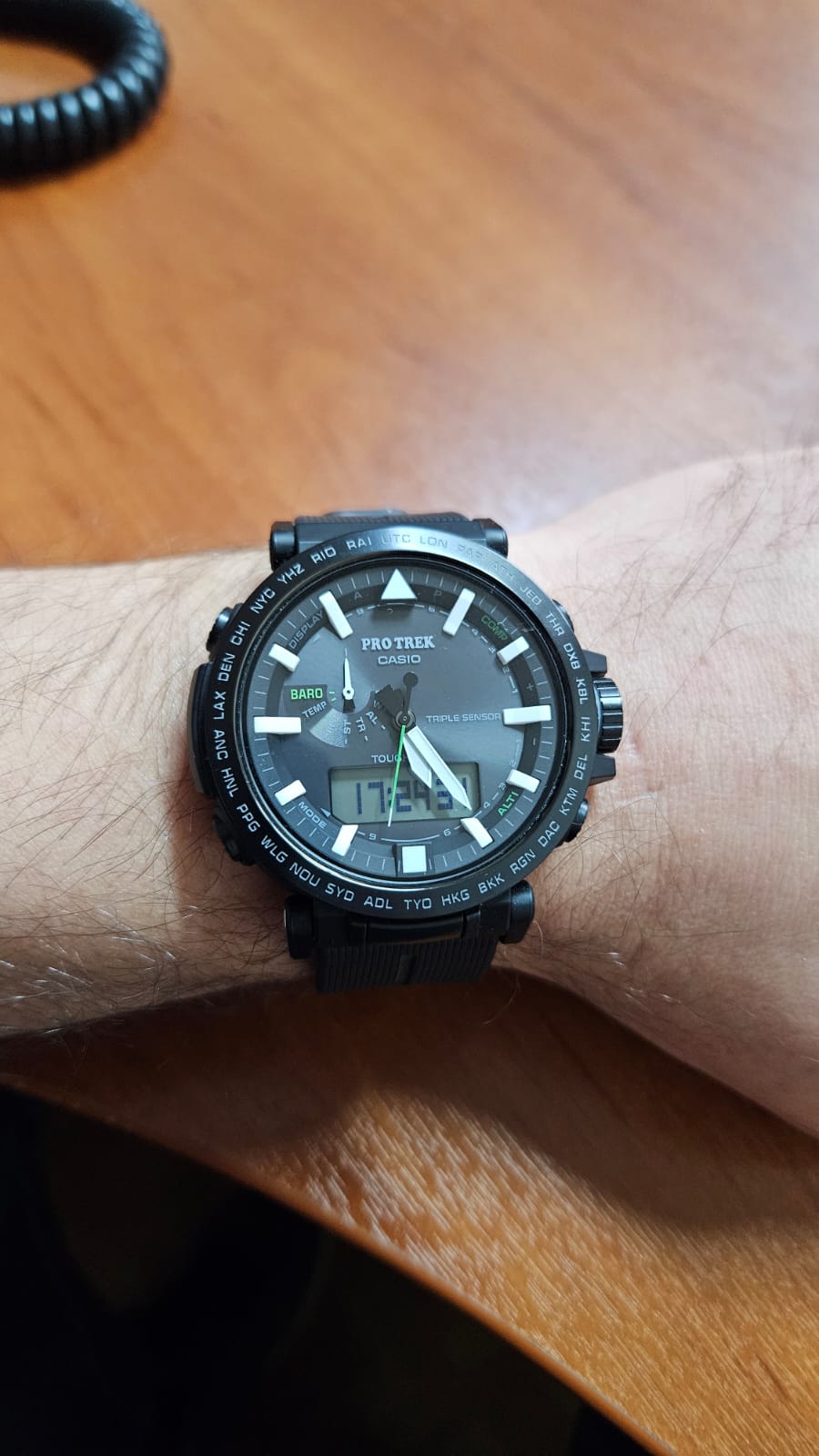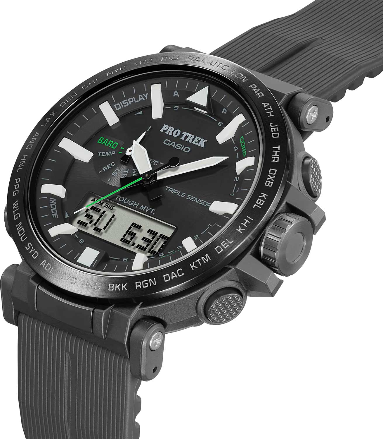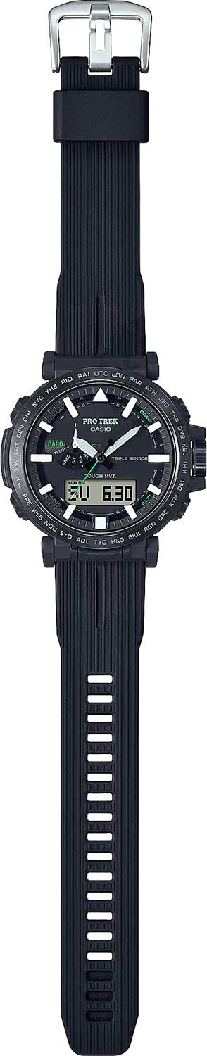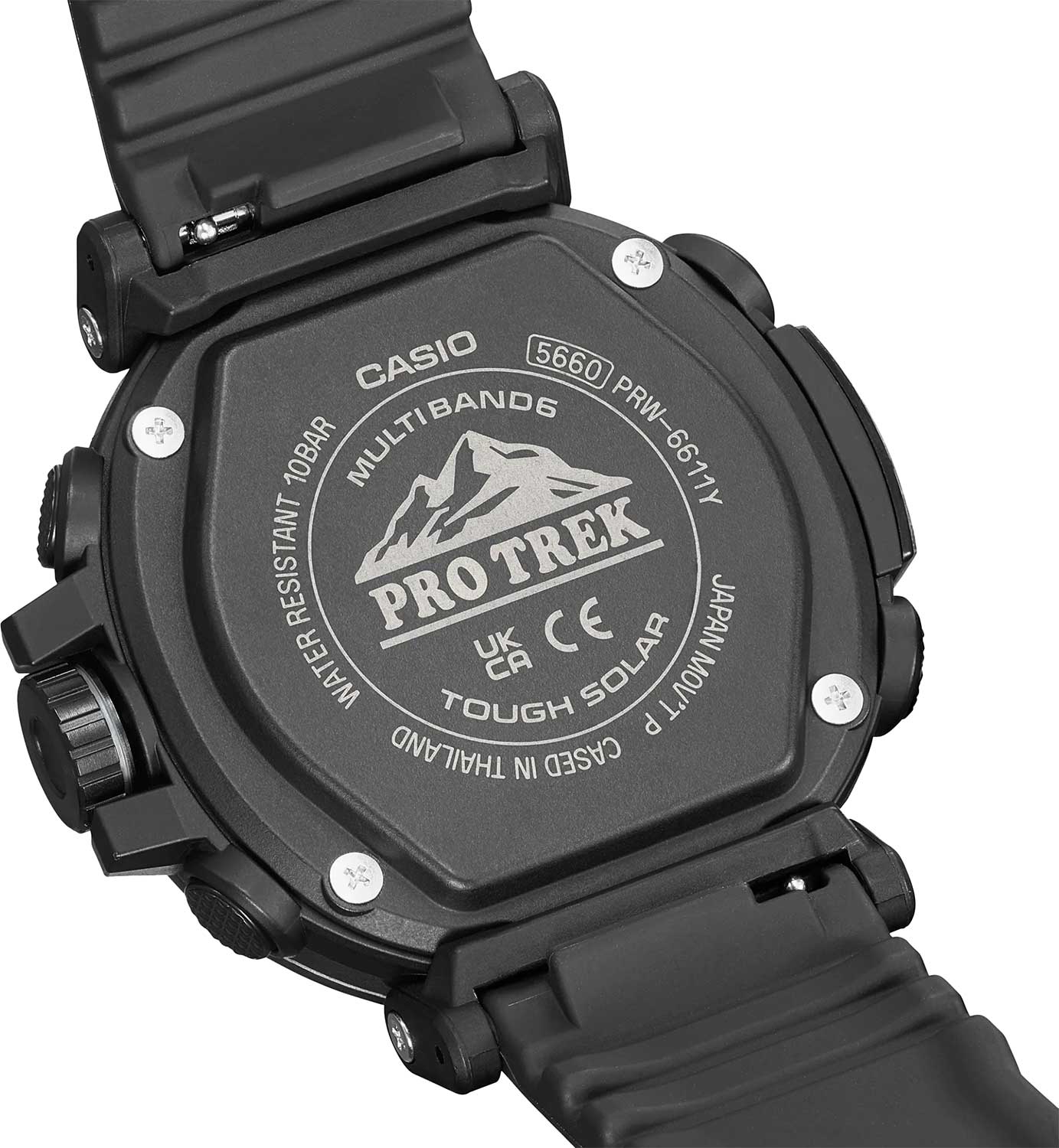Мужские японские наручные часы на солнечной батарее Casio Pro Trek PRW-6621Y-1ER, кварцевый механизм с высокой точностью. Корпус выполнен из высококачественного пластика со вставками стали с IP-покрытиемIP-покрытиеМетод ионного напыления. Демонстрирует повышенную устойчивость к истиранию, окислению и химическим веществам. Под воздействием высокого давления и температуры около 1500°C молекулы металла надёжно соединяются с частицами корпуса часов.. Класс водозащиты: 100 метров, позволит плавать, нырять и заниматься другими водными видами спорта. Технология Tough SolarTough SolarТехнология основана на подзарядке аккумулятора от источника солнечного света, специальная панель улавливает солнечные лучи и преобразует их в энергию для работы часов. Достаточно пары минут нахождения на солнце для функционирования часов в течении суток.. Автоматическая подсветка при наклоне часов в сторону лица. СекундомерСекундомерСекундоме́р — прибор, способный измерять интервалы времени с точностью до долей секунды., сплит-хронографСплит-хронографИспользуется для измерения продолжительности нескольких временных отрезков, начинающихся одновременно, а заканчивающихся в разное время., таймерТаймерОтсчитывает секунды в обратном направлении в заданном интервале времени., мировое времяМировое время Полезное часовое усложнение, отображающее время в основных городах и известных областях по всему миру, оно связано с часовыми поясами, удобно для путешественников и бизнесменов. 29 часовых поясов, всемирное координированное время. Встроенный цифровой компас измеряет и отображает направление в виде одной из 16 точек. Диапазон измерения от 0° до 359° с разрешением 1°. Стрелочная индикация севера. Коррекция магнитного склонения. Высотомер - встроенный датчик барометрического давления с возможностью вывода результатов в единицах высоты над уровнем моря (от -700 до 10000 метров). Термометр от -10° до +60°С.