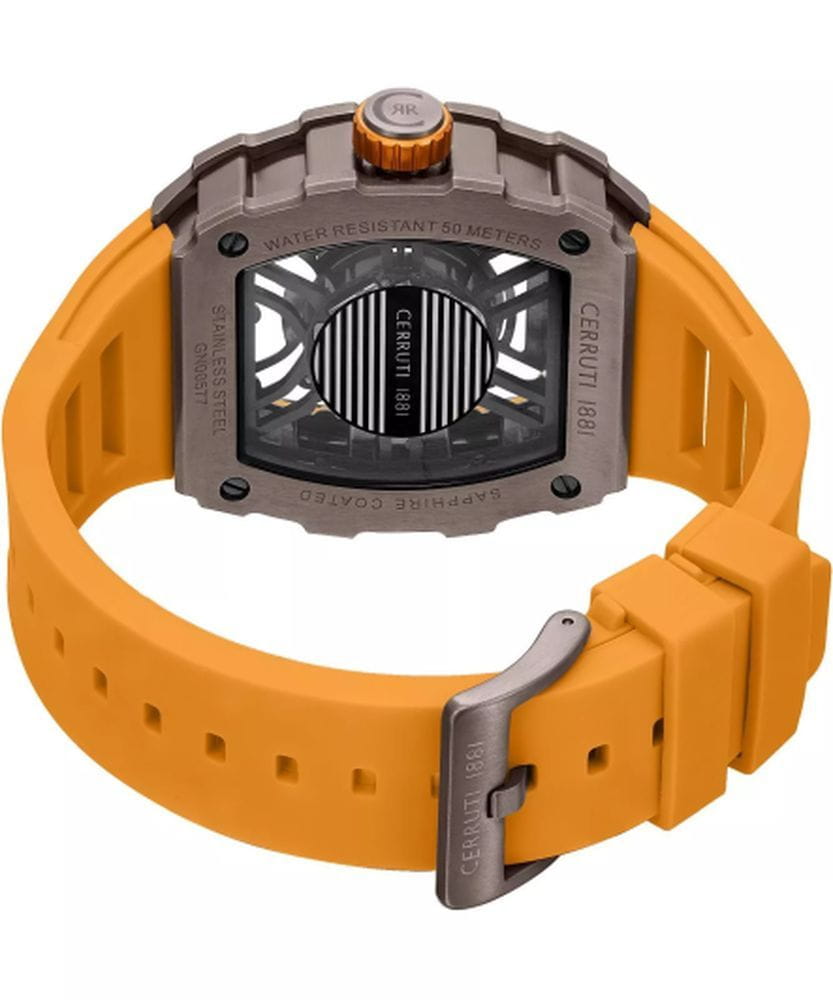 Cerruti 1881 CIWGN0057704 — эффектные мужские часы с дерзким современным дизайном, в которых сочетаются геометрическая точность линий и выразительная динамика формы. Корпус из нержавеющей стали с матовым PVD-покрытиемPVDУльтратонкое покрытие наносится в технике вакуумного напыления, сочетает в себе нитрид титана особой прочности со слоем золота или оксида хрома. Несёт в себе декоративную или защитную функцию. и мощным шестигранным безелемБезельВнешний ободок, закрепляющий стекло. В спортивных часах так называется поворотное кольцо с делениями на циферблате, выполняет роль таймера – замеряет отрезки времени на шкале. Неподвижный безель – элемент декора. Однонаправленно вращающийся безель на дайверских часах позволяет фиксировать моменты погружения и выныривания на поверхность. подчёркивает технический характер модели. Полупрозрачный скелетонизированный циферблат открывает детали механизма, придавая часам индустриальный и технологичный облик. Контрастные стрелки и метки с люминесцентным покрытиемЛюминесцентное покрытиеПозволяет считывать показания времени в темноте. Производители наносят на стрелки, часовые индексы, безель или поверхность циферблата светонакопительный состав, дающий холодное свечение. обеспечивают отличную читаемость, а прочное минеральное стеклоМинеральное стеклоМинеральное стекло представляет собой искусственно выращенный минерал кварца. Такое стекло отличается особой устойчивостью к повреждениям и царапинам. Уступает по некоторым качествам сапфировому стеклу. защищает композицию от внешних воздействий. Эластичный силиконовый ремешок гармонично сочетается с оттенками корпуса и обеспечивает комфорт при ежедневном ношении. Cerruti 1881 — это смелое воплощение итальянского стиля в спортивно-индустриальной эстетике, созданное для мужчин, уверенно идущих в ногу с временем.