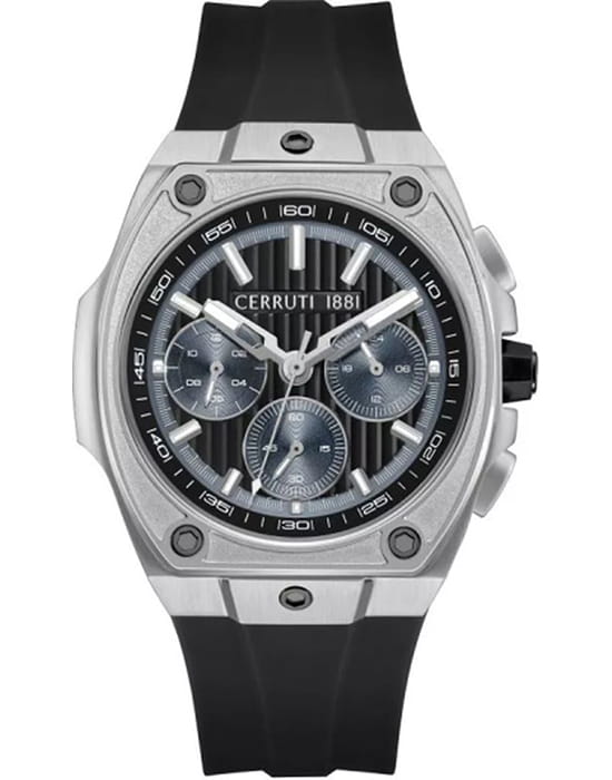Cerruti 1881 CIWGO0085001 — эффектные мужские часы, сочетающие индустриальную мощь и современную элегантность. Корпус из нержавеющей стали с массивным восьмигранным безелемБезельВнешний ободок, закрепляющий стекло. В спортивных часах так называется поворотное кольцо с делениями на циферблате, выполняет роль таймера – замеряет отрезки времени на шкале. Неподвижный безель – элемент декора. Однонаправленно вращающийся безель на дайверских часах позволяет фиксировать моменты погружения и выныривания на поверхность. и декоративными винтами подчёркивает силу и характер дизайна. Глубокий чёрный циферблат с тремя счётчиками хронографаХронографФункция позволяет измерять отрезки времени с особой точностью: часы, минуты, секунды. Верным признаком хронографа является наличие на циферблате 3 дополнительных окошек-счётчиков. и рельефной текстурой придаёт модели динамичность, а контрастные стрелки и метки с люминесцентным покрытиемЛюминесцентное покрытиеПозволяет считывать показания времени в темноте. Производители наносят на стрелки, часовые индексы, безель или поверхность циферблата светонакопительный состав, дающий холодное свечение. обеспечивают превосходную читаемость при любом освещении. Прочное минеральное стеклоМинеральное стеклоМинеральное стекло представляет собой искусственно выращенный минерал кварца. Такое стекло отличается особой устойчивостью к повреждениям и царапинам. Уступает по некоторым качествам сапфировому стеклу. защищает циферблат от царапин, а мягкий каучуковый ремешок обеспечивает комфорт при ежедневном ношении. Cerruti 1881 — это воплощение итальянского стиля, надёжности и уверенности, идеально подходящее для мужчин, ценящих современные формы и функциональную эстетику.